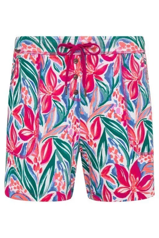 Женские трикотажные шорты Жокей с цветочным принтом - Jockey® Supersoft Shorts 850024 755. Приятный, струящийся материал 95% модал, 5% эластан. Выполнены из мягкого струящегося материала высокого качества. Короткие шорты выше колен с регулировкой объема шнурком. Шнурок с металлическими кончиками. Два боковых кармана с декоративной отстрочкой, декоративная фальш-застежка на пуговицах. На боку - фирменная эмблема. Эффектный принт с цветами и листьями в оттенках розовая фуксия и изумрудно-зеленый.