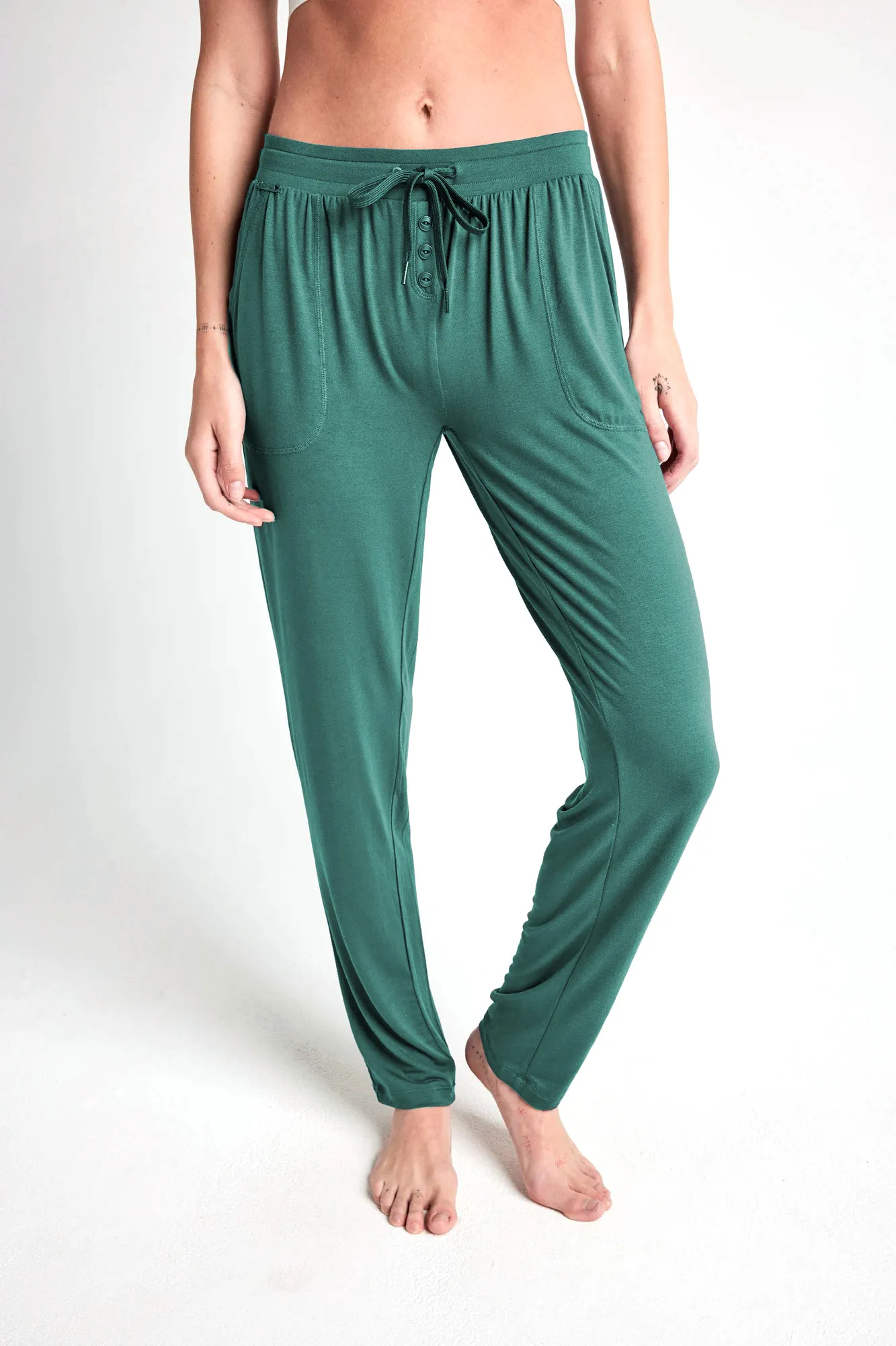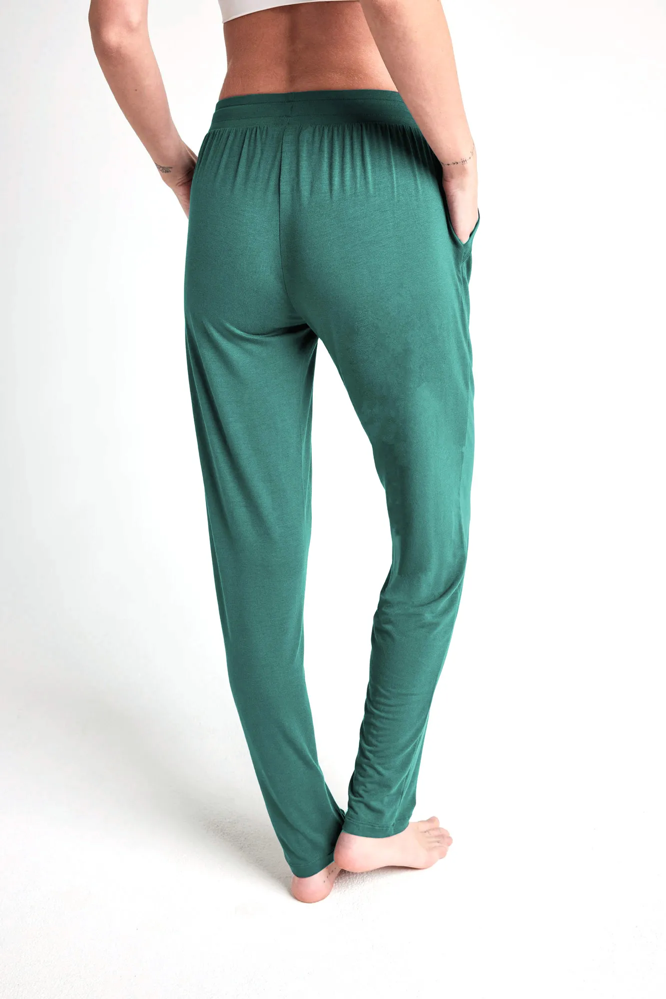 Женские домашние брюки из серии Jockey Суперсофт однотонные изумрудно-зелёного цвета из комфортного трикотажного модала - 850015H - 530 amazon. Брюки заужены к низу. Широкий пояс с регулировкой объема и шнуровкой, боковые карманы.