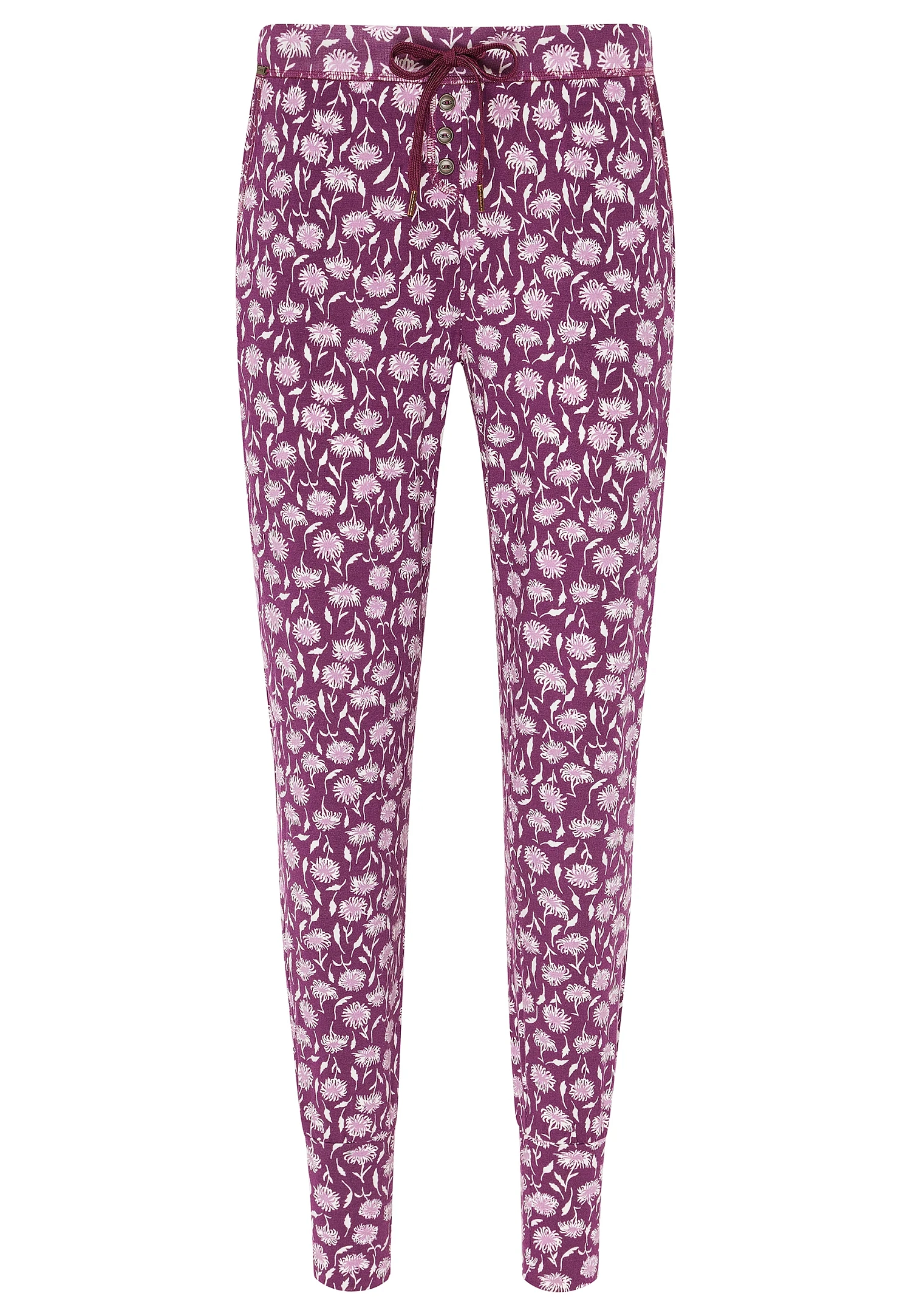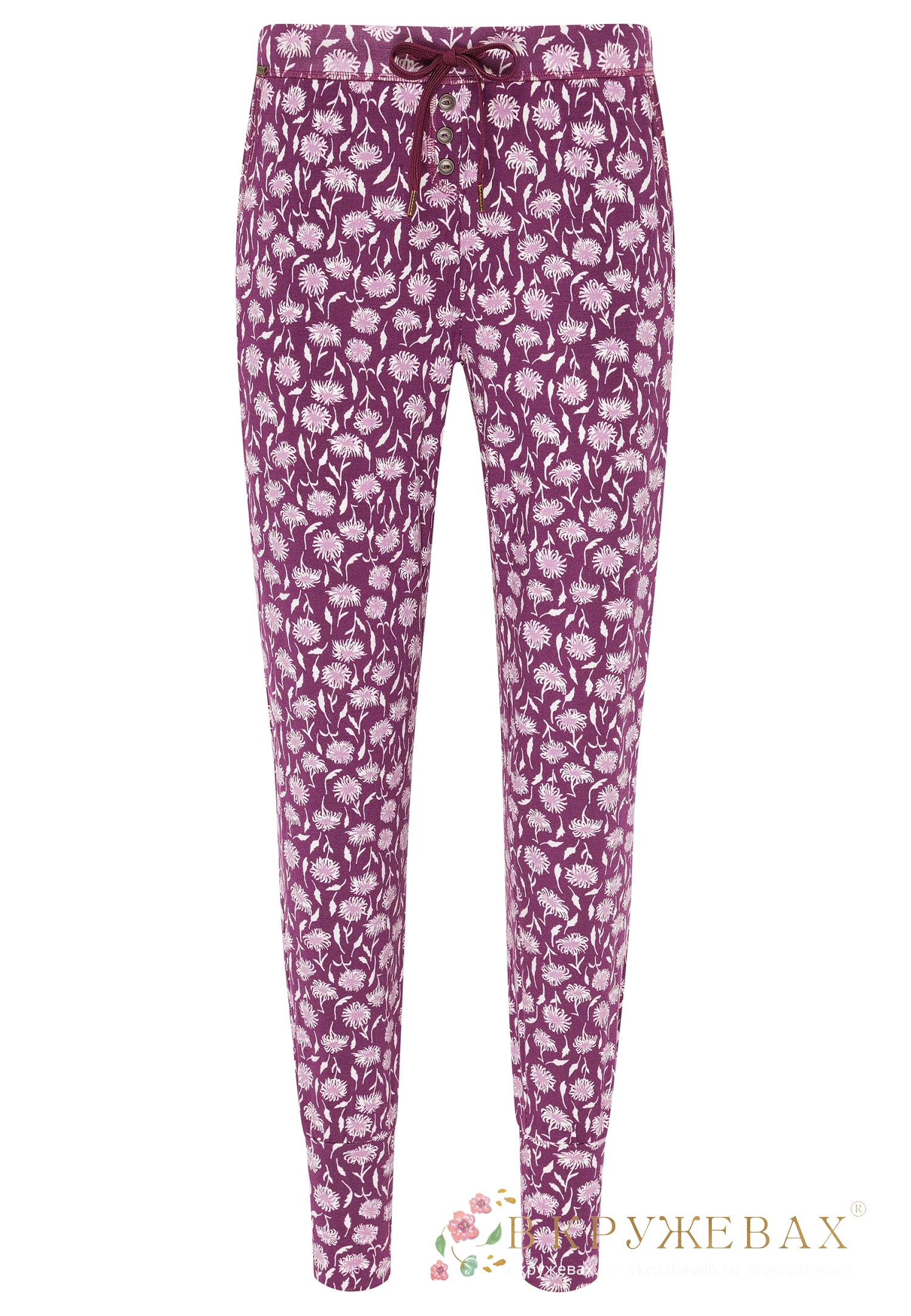 Женские трикотажные брюки-джоггеры Жокей с принтом в мелкий цветочек на бордово-сливовом фоне - Jockey® Supersoft Lounge Jogger 850023H 733 vintage plum. Выполнены из нежного струящегося трикотажного материала: 95% модал, 5% эластан. Брюки заужены к низу, на широких манжетах. Широкий пояс с регулировкой объема и шнуровкой, боковые карманы. Шнурок с металлическими кончиками. Декоративная застежка на пуговицы впереди. На боку - фирменная эмблема. Эффектный принт с белыми контурными цветочками на бордовом фоне.