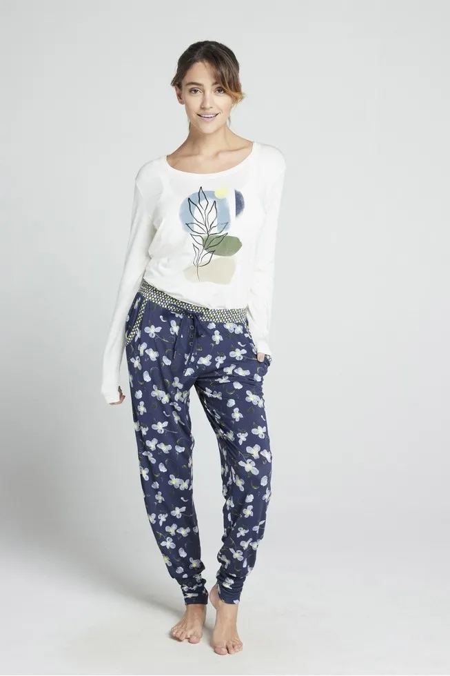 Женские брюки Жокей Софт с флористическим принтом на тёмно-синем фоне, из трикотажного модала 95%, эластан 5% - Jockey® Soft 8508222 - 463 Dark Iris. Широкий эластичный пояс со шнурком для фиксации объема контрастного лимонно-синего цвета. Брюки заужены к низу, внизу на широких манжетах. Впереди декоративная застежка на пуговицы. Боковые карманы.