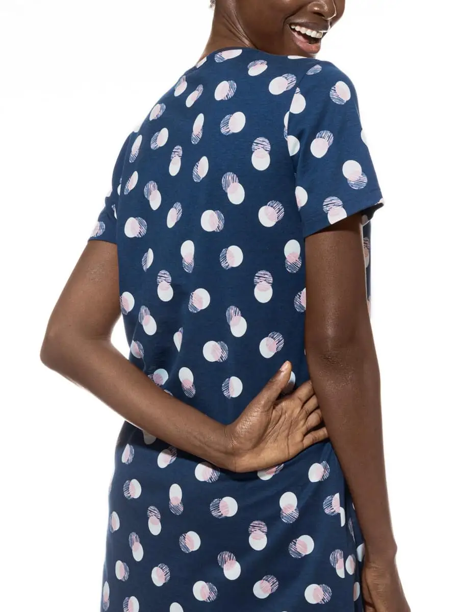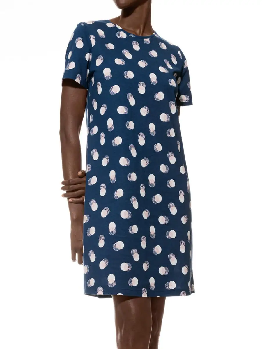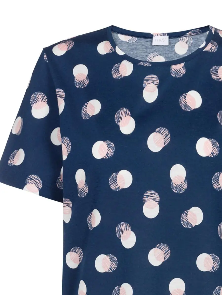 Ночная сорочка в горошек Мэй с необычными горошками на синем фоне - Mey SERIE SCRIBBLED DOTS 1230011 1118 deep marine. Чуть зауженный силуэт. Полукруглая горловина. Короткие рукава. Длина - выше колен. Выполнена из высококачественной трикотажной ткани: 100% хлопок.