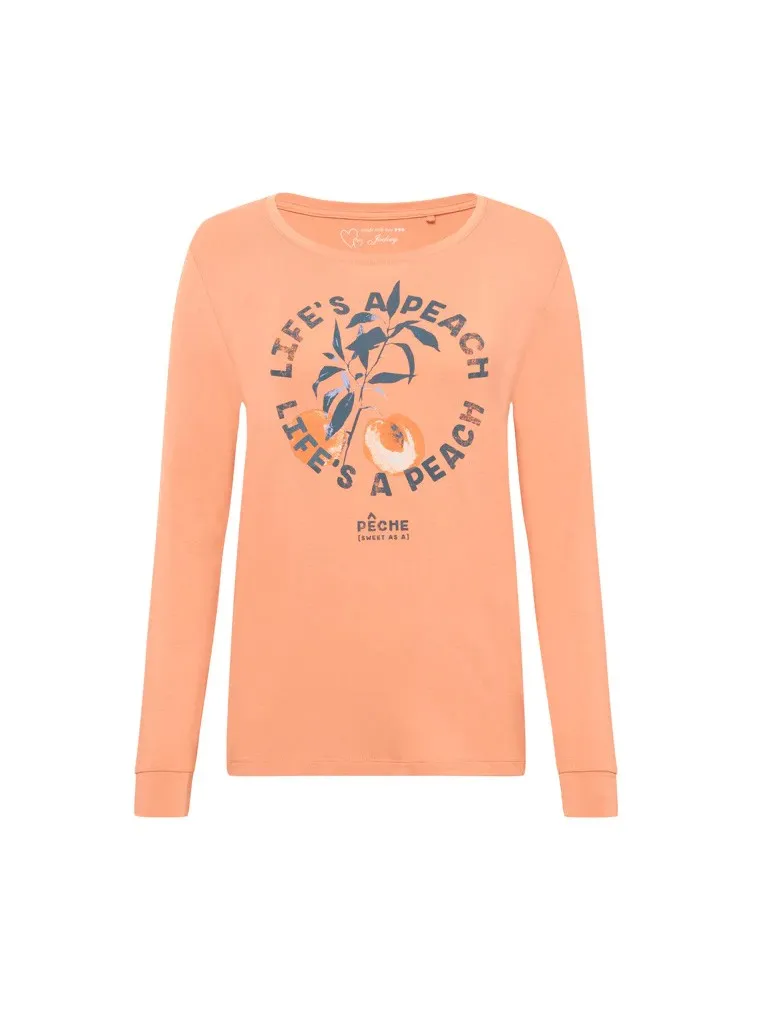 Лонгслив женский Жокей с персиками - Jockey® Relaxed Comfort 8603222 - 297 персикового цвета, однотонный с принтом и декоративной надписью Life's a peach. Длинный рукав на манжетах, спущенное плечо, горловина-лодочка. Выполнен из комфортного и мягкого трикотажного материала: 95% модал, 5% эластан