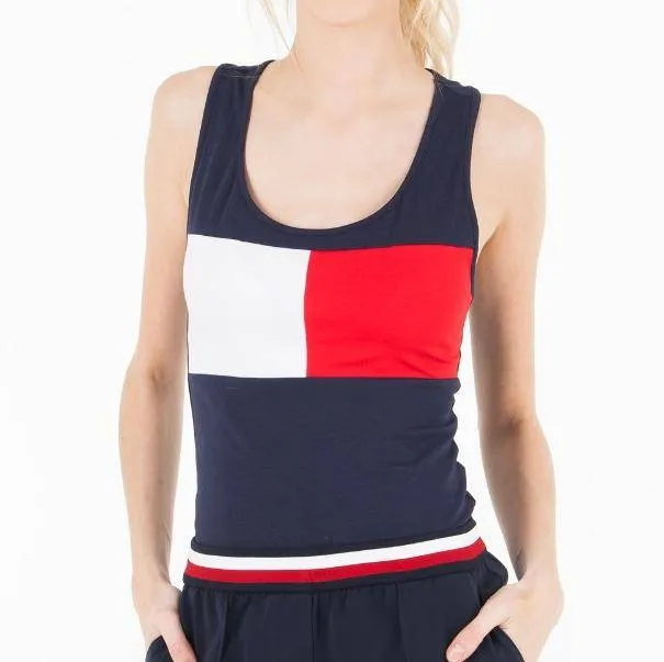 Женский топ Томми Хилфигер белый с красным и синим цветовыми блоками.
