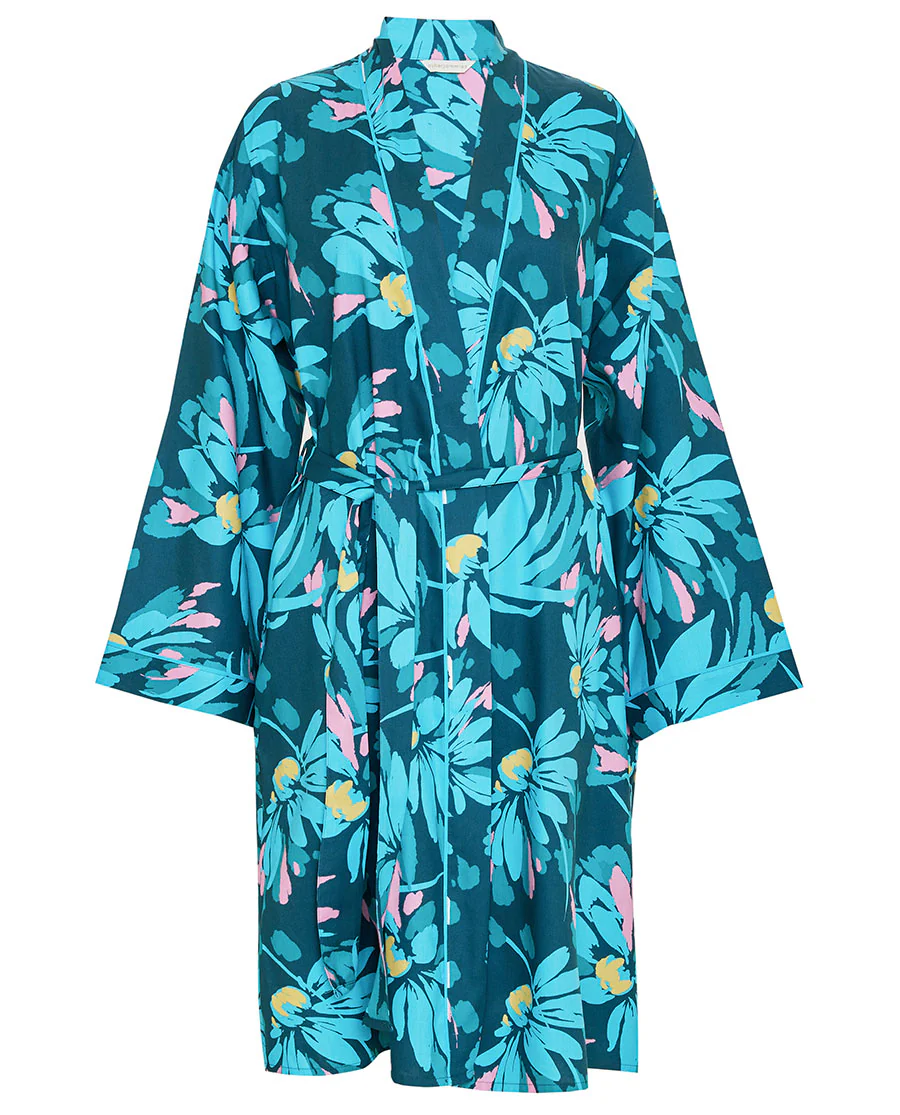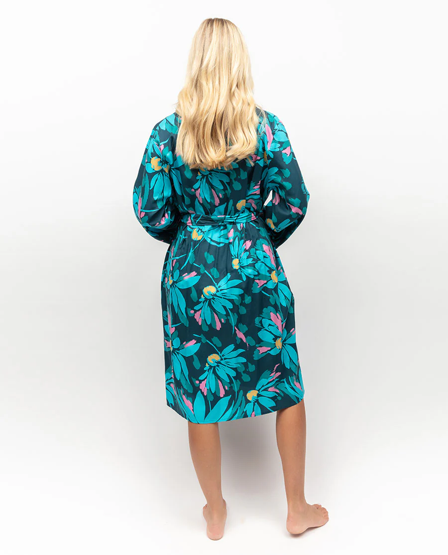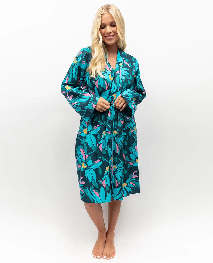 Домашний халат Сайберджамиз с цветочным принтом в изумрудных оттенках - Cyberjammies Floral Print Short Dressing Gown 0200 teal mix. Короткий халат-кимоно с запахом ниже колен. Выполнен из мягкого, струящегося материала 60% хлопок, 40% модал. Широкие длинные рукава, пояс в цвет изделию. Декоративная окантовка на манжетах или полах халата.
