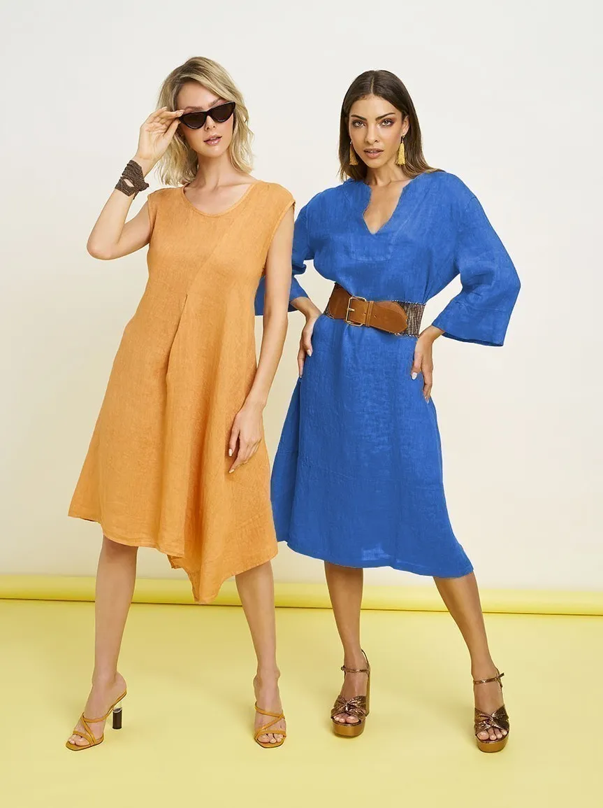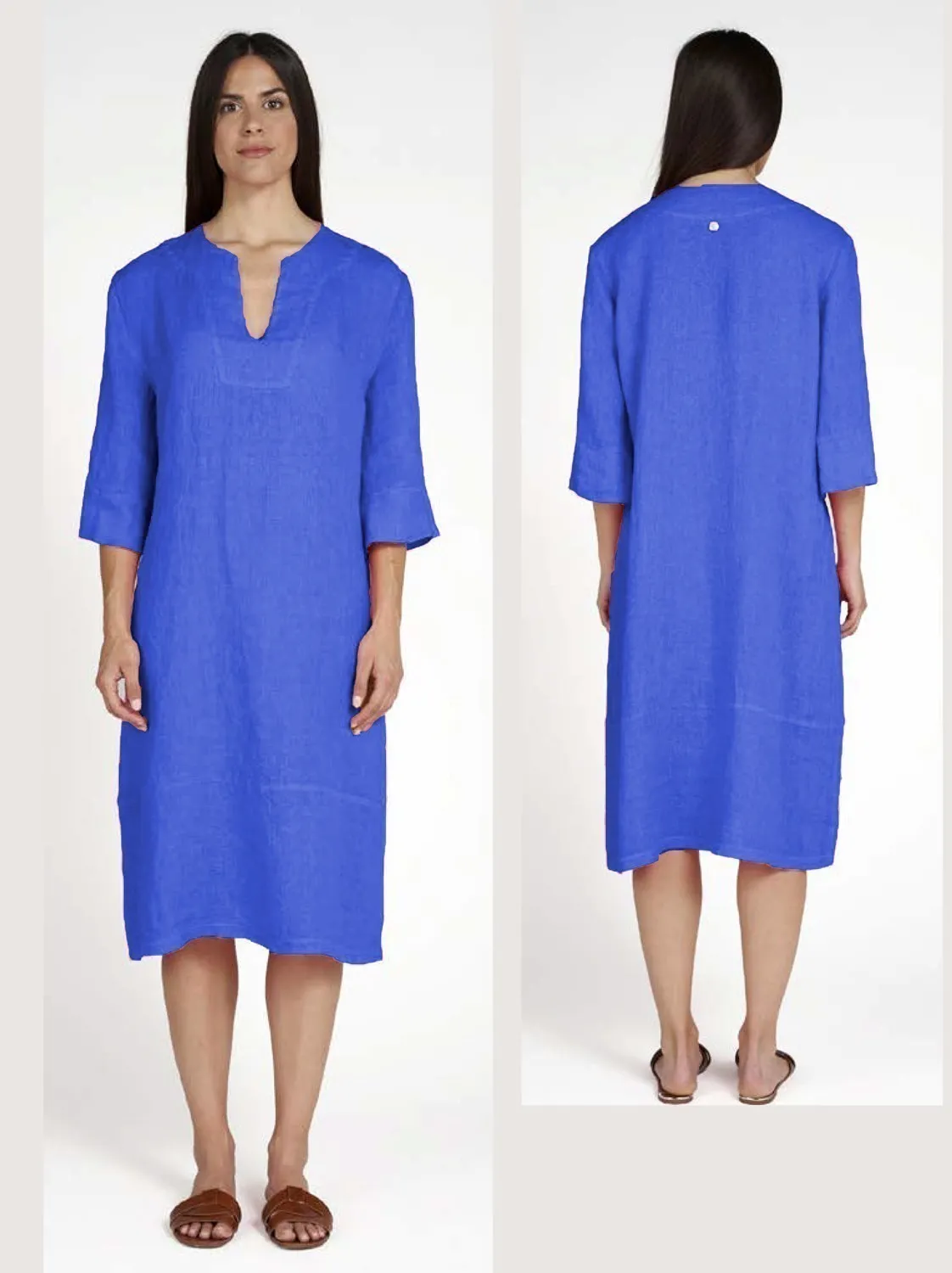 Льняное платье-миди LFDL La Fabbrica Del Lino ярко-синего цвета кобальт - 930 411 cobalto. 100% лён. Воротник-стоечка и V-образная горловина. Короткие рукава. Чуть завышенная линия талии, широкая юбка с боковыми карманами. Сзади эффектная деталь - перламутровая пуговица под воротником. Сшито в Италии.