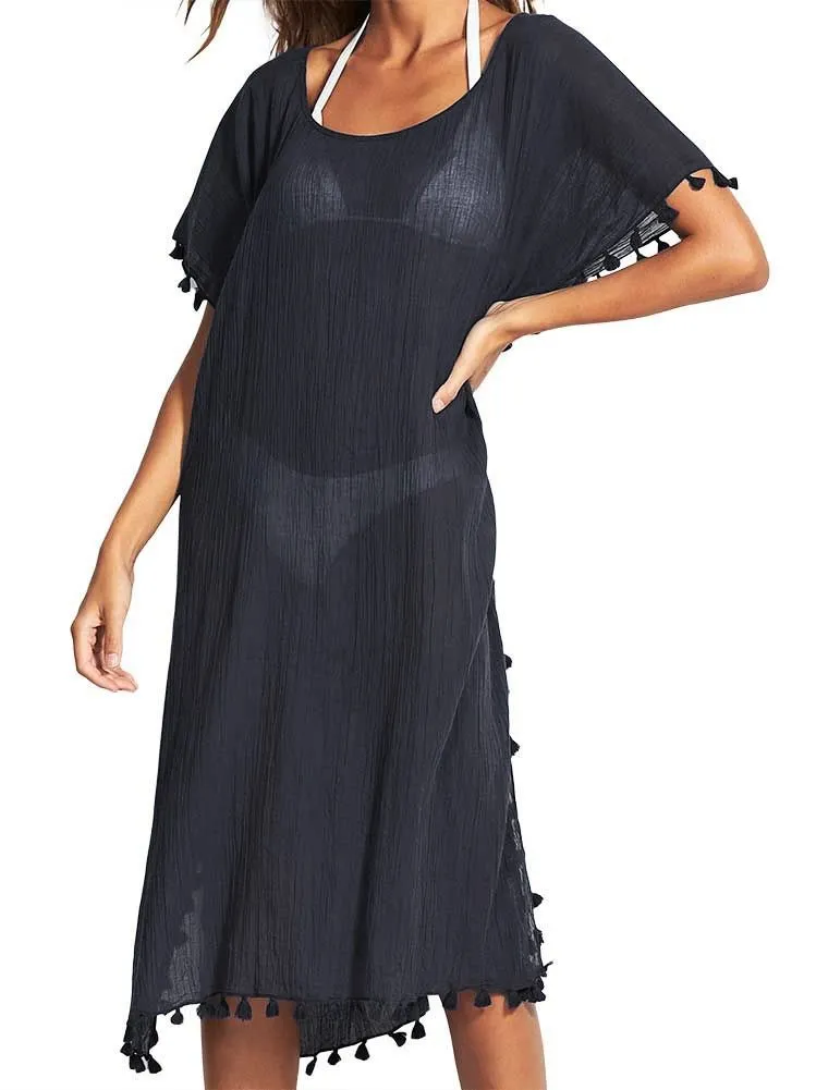 Кафтан-туника миди Сифолли Амнезия чёрного цвета - Seafolly BEACHEDIT Amnesia Kaftan 53638 black BLK. 100% хлопок, жатая фактура ткани. V-образная горловина с декоративными кисточками по краю всего изделия. Короткий рукав. Универсальный размер. Длина - до середины голени.