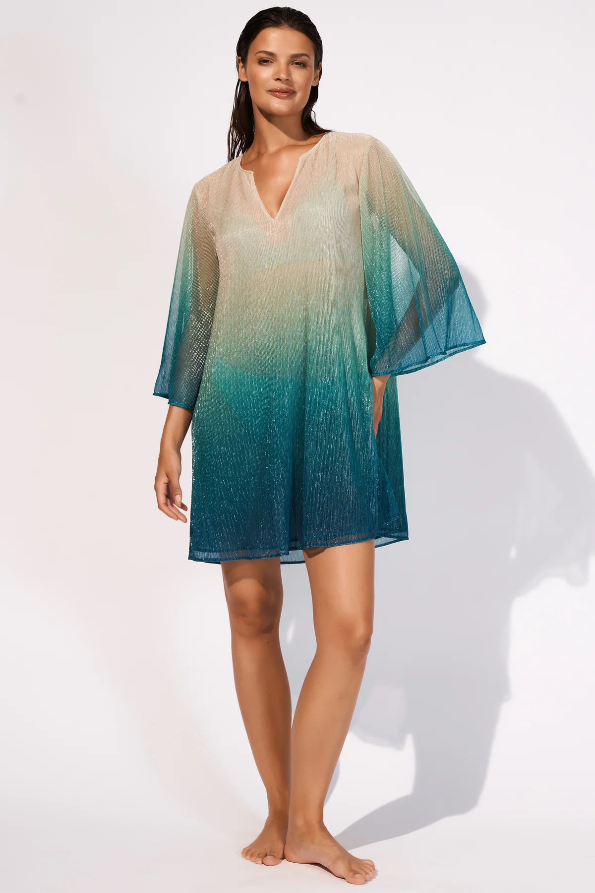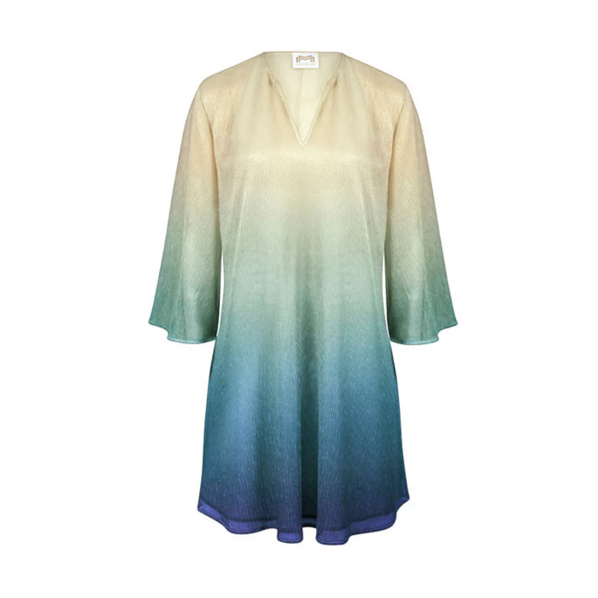Короткое блестящее платье-туника Мариан Мельхорн Гармония с бежево-голубым градиентом и люрексовой нитью - Maryan Mehlhorn Harmonia TUNIC M3696629426 / M3696 629 426. Полукруглая горловина с V-образным вырезом. Длинные рукава на кокетке. Расширяющиеся к низу рукава 3/4. А-образный силуэт, длина - выше колен. Выполнен из красивого трикотажного материала: 65% полиэстер 35% люрекс.