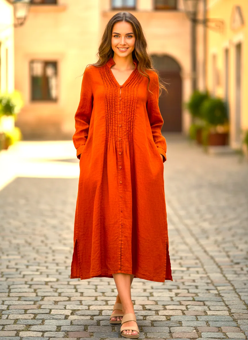 Роскошное льняное платье-рубашка Гризас ярко-оранжевого цвета пламя - Grizas Dress 91876-L400 627 flame orange. Классический рубашечный крой с застежкой на пуговицы от горловины до низа. Можно расстегнуть полностью. Свободный крой, A-образный силуэт, немного приталенный. Треугольный воротник-стоечка. Длинные рукава на манжетах с лёгкой сборкой. Красивые декоративные складки на груди создают необычную текстуру и добавляют нижней части платья. По бокам - неглубокие разрезы.