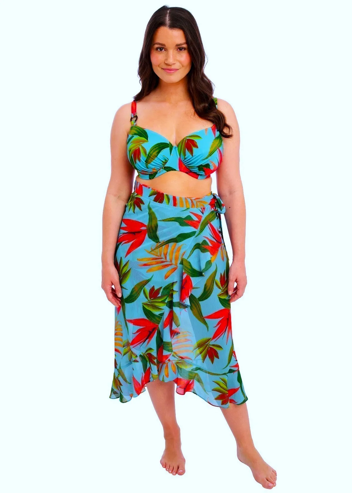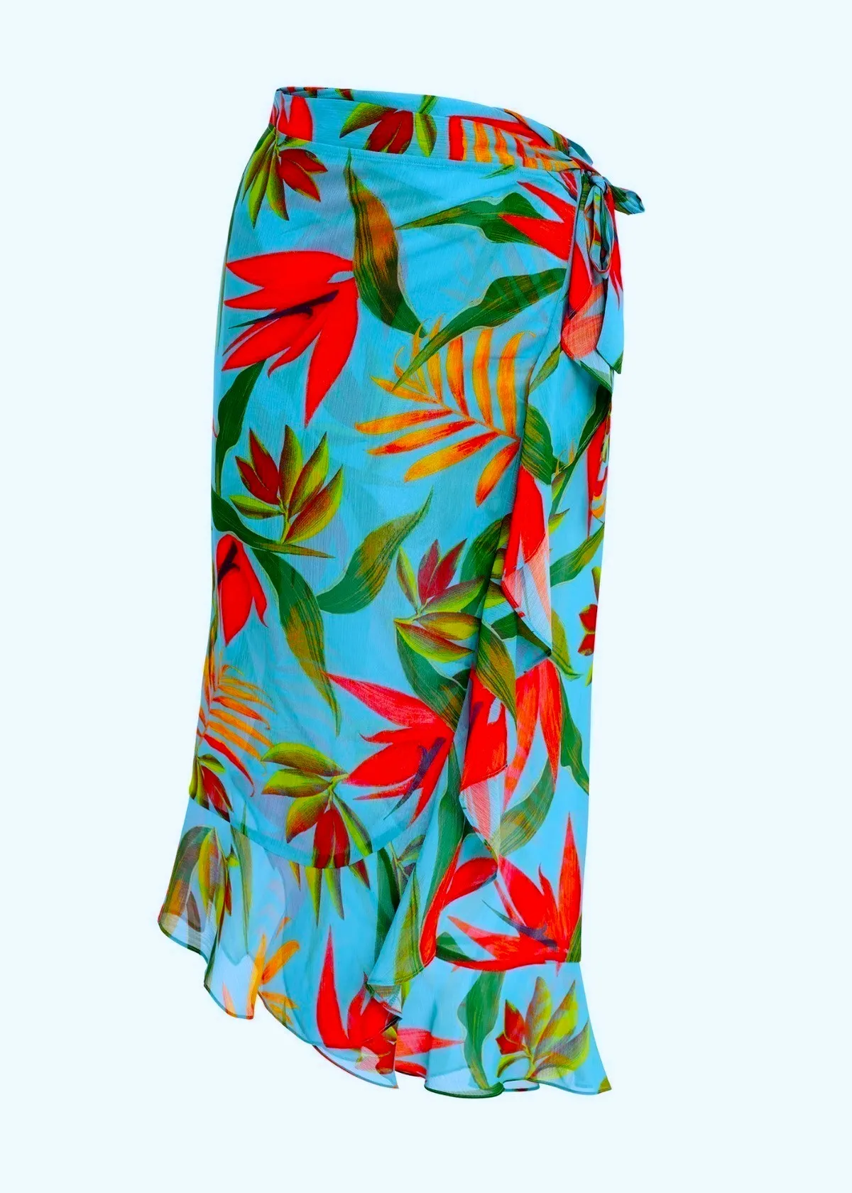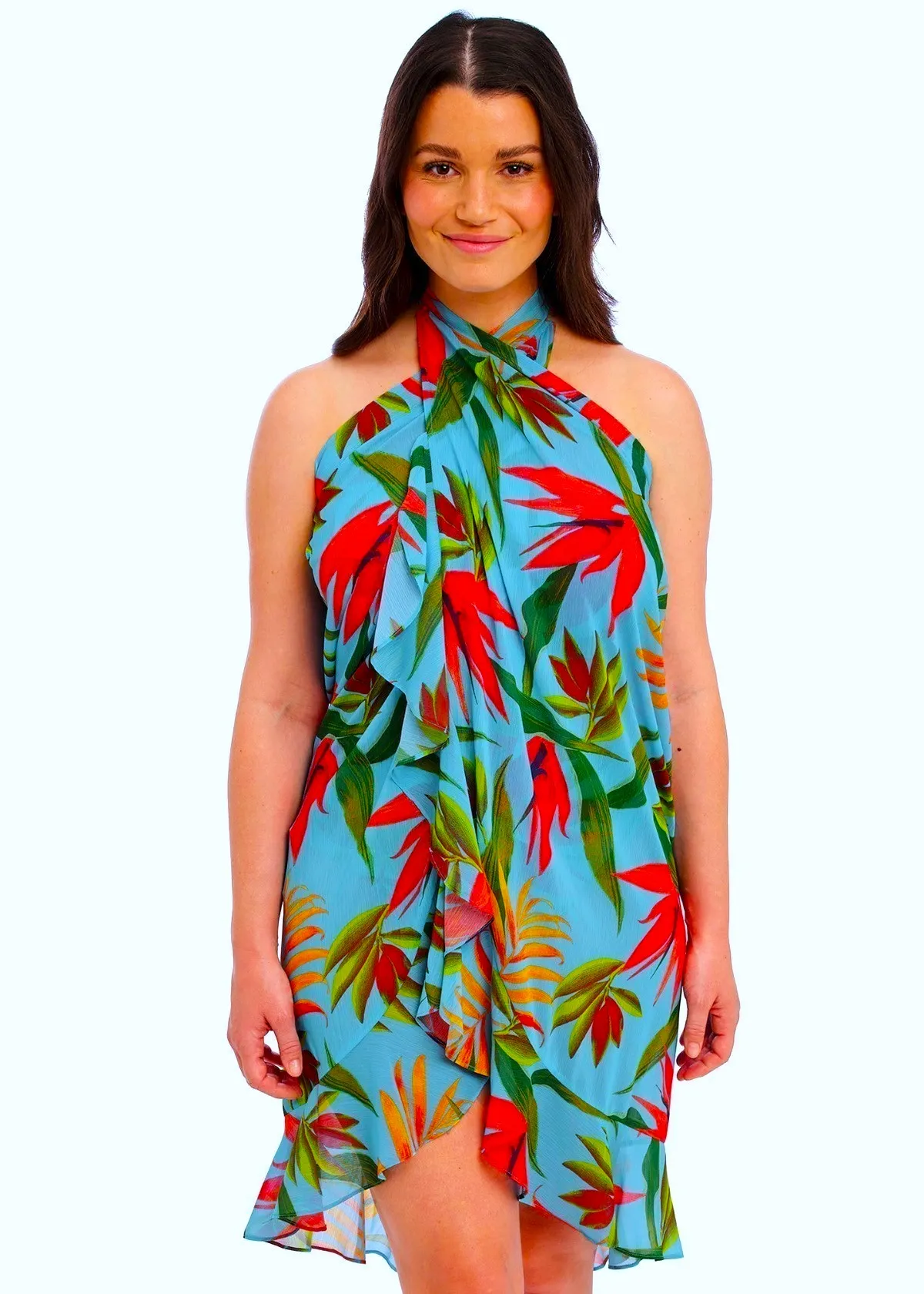 Пляжная юбка-саронг Фентези Пичола с ярким тропическим принтом на голубом фоне - Fantasie Pichola Sarong 503991 Aqua AQA. Универсальная модель - можно носить как юбки и как сарафан, красивый многослойный крой с оборкой. Юбка с запахом на поясе, полностью раскрывается. Возможны разные варианты использования - обратите внимание на фотографии.