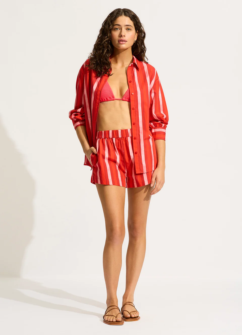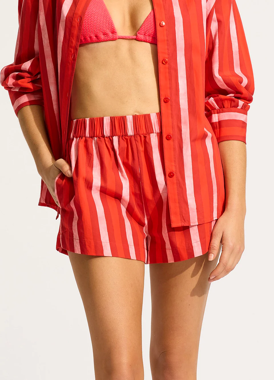 Короткие шорты Сифолли ярко-красного цвета с вертикальными бежевыми полосками - Seafolly Cropped Short 55404-SH flame, 100% органический хлопок, текстильное полотно. . Широкий крой. На широком эластичном поясе. По бокам - врезные карманы.