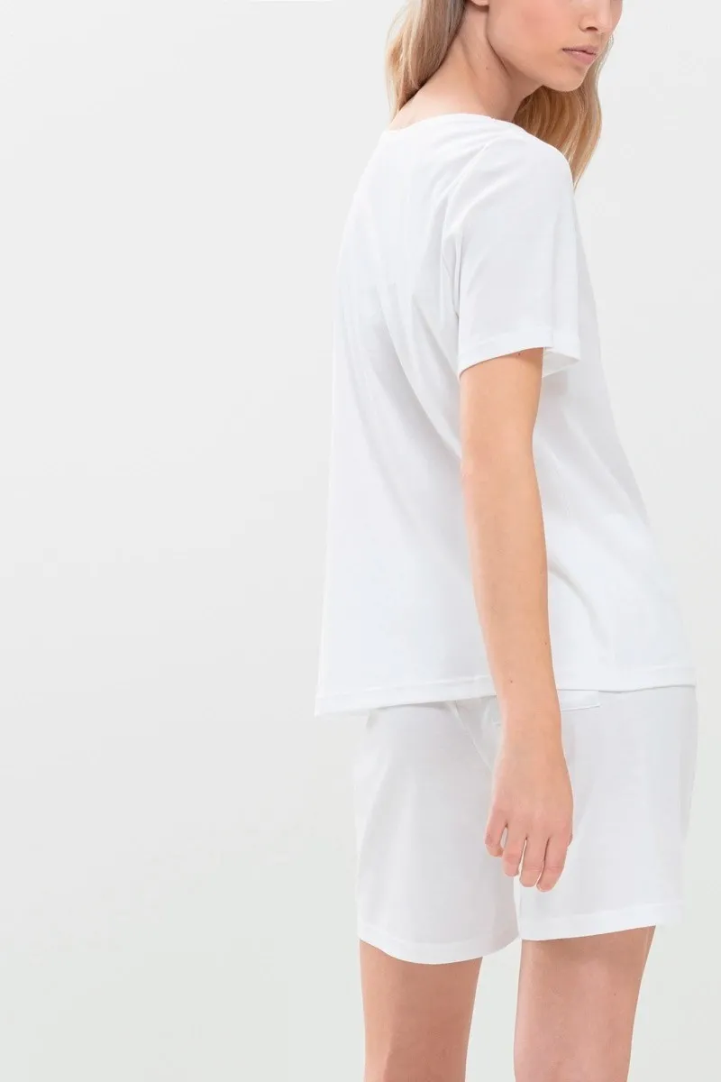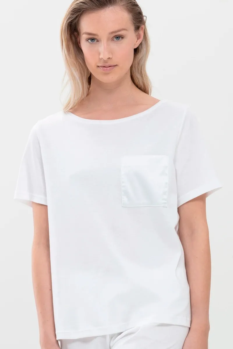 Пижамная футболка Мей Слипсейшн белого цвета - Mey Sleepsation shirt 1/2 armel gots 17213. Открытая горловина-лодочка, короткие рукава, нагрудный накладной карман из шелковистой ткани. 100% хлопковый трикотаж роскошного качества, экологически чистый.