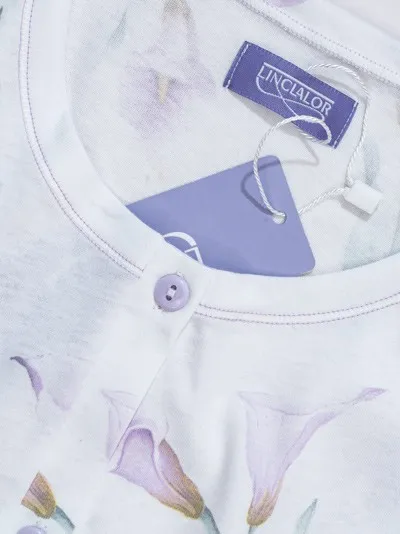 Итальянская женская пижама брюки и кофта с коротким рукавом LINCLALOR 74664 lilla. Кофта с фиолетовыми цветами Каллами на белом фоне, с закругленной горловиной, на пуговицах, короткий рукав. Брюки однотонно голубые. 100% хлопковый трикотаж-интерлок