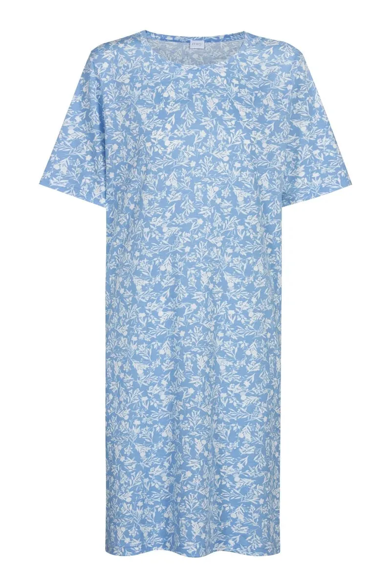 Женская ночная сорочка Мэй Флауэ Мидоу с белым цветочным принтом на голубом фоне - Mey Nachthemd Flower Meadow 1230003 1116. Прямой крой как у длинной футболки. Полукруглая горловина, короткие рукава. Декоративная отстрочка. Выполнена из высококачественной трикотажной ткани: 100% хлопок.