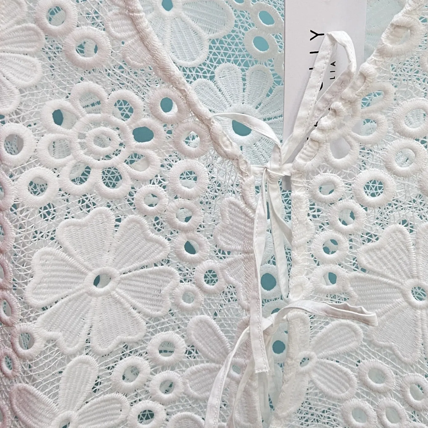 Кружевной ажурный топ Сифолли Крокет белый - Seafolly Crochet 55092-TO. Обработка краев - хлопок-батист, кружево - из синтетического материала. Ажурная вышивка ришелье. Жилет на завязочках.