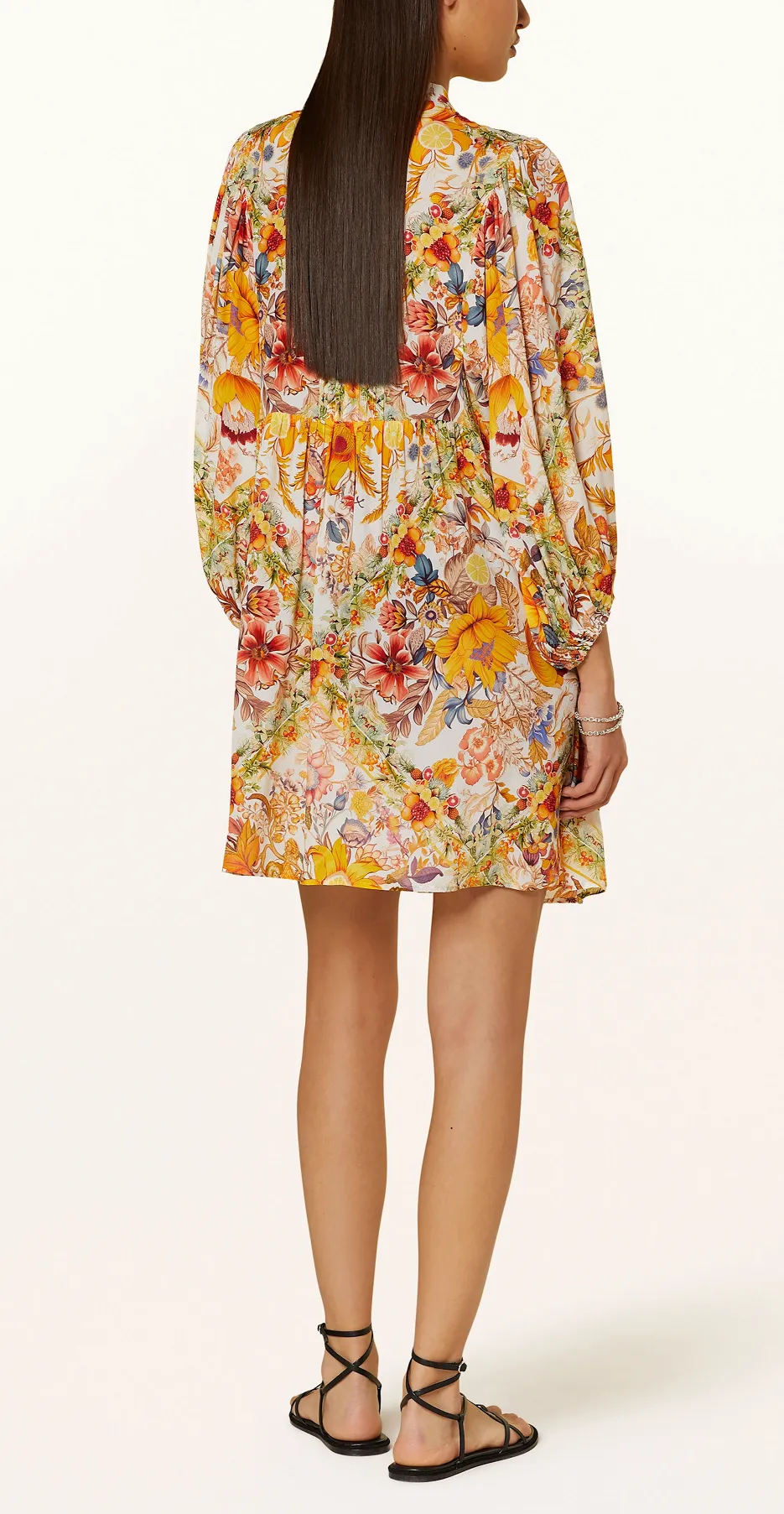 Платье с шёлком Мариан Мельхорн с жёлтыми цветами и фруктами на белом фоне - Maryan Mehlhorn Exuberance M3688608 / M3688 608 165 solar. Выполнено из очень приятного струящегося текстильного материала: 65% вискоза, 35% натуральный шёлк. Завышенная линия талии с декоративными складками на груди и широкой юбкой воланом. Сзади - кокетка со складками. V-образная горловина с застежкой и декоративными текстильными петлями. Застежка на пуговицы - до середины груди. Широкие рукава на манжете-резинке.