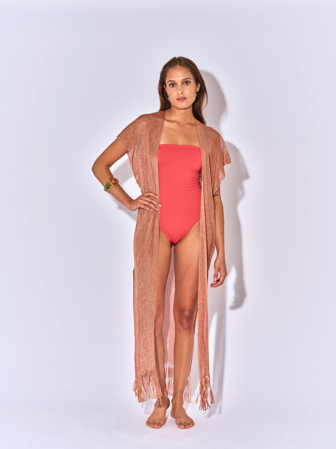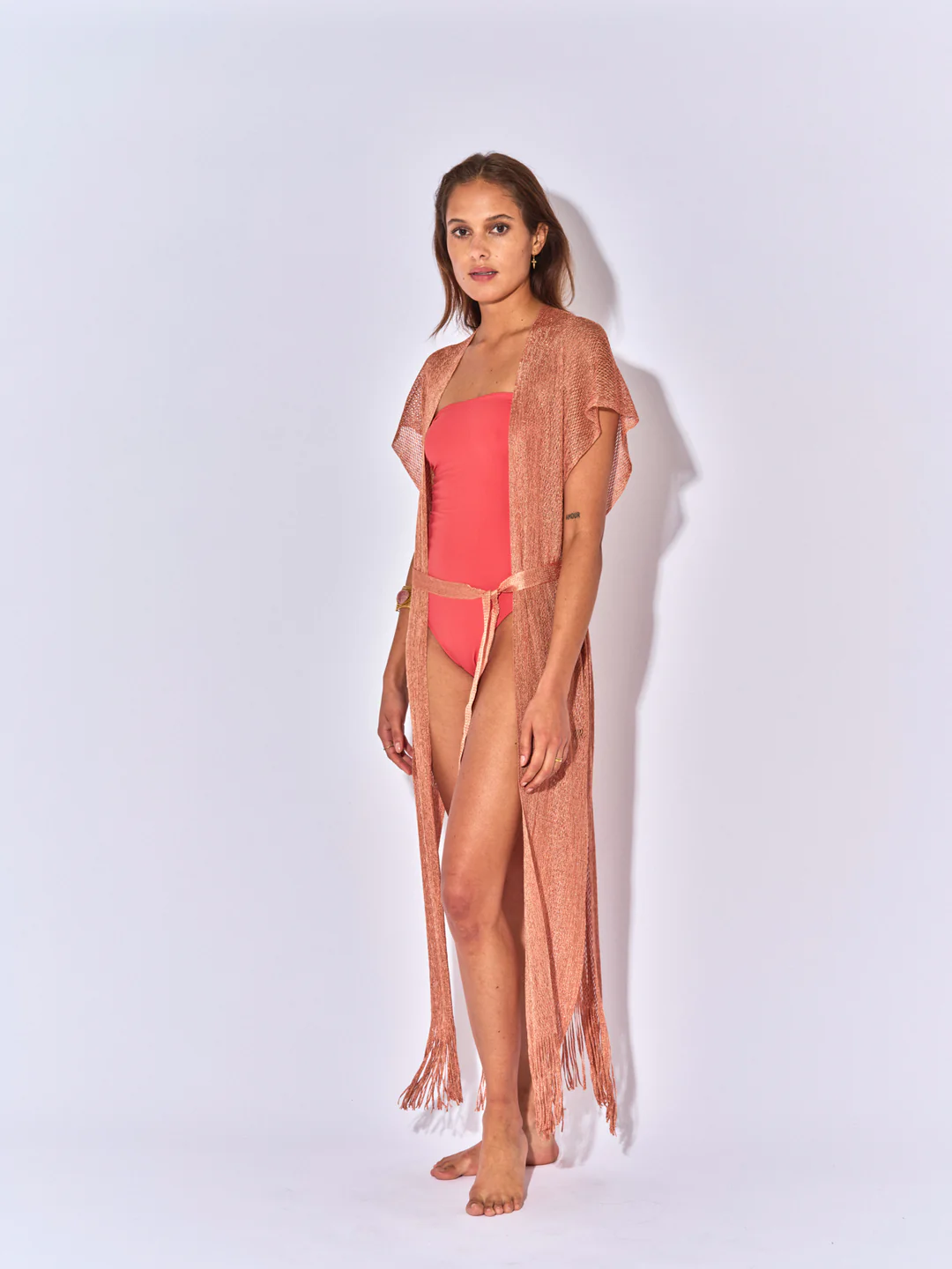 Роскошная длинная туника для отдыха и пляжа Белиза Лима золотисто-розового цвета личи - Beliza LIMALX-SIENNE-TU LONG GILET EN MAILLE PAILLETE SANS MANCHES LITCHI. Красивая блестящая фактура с люрексовыми нитями. Легкий халат из ткани-сеточки с глубокими разрезами по бокам и бахромой. Прямой крой, завязывается поясом. Пояс в цвет туники - в комплекте.