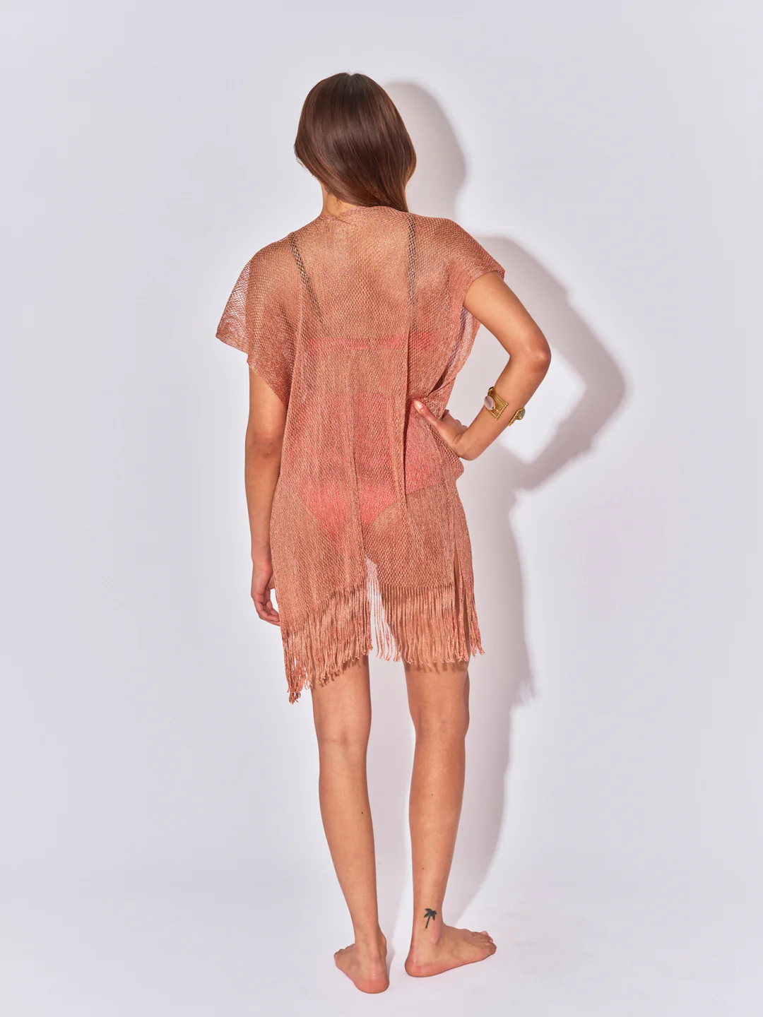 Роскошная короткая туника для отдыха и пляжа Белиза Лима золотисто-розового цвета личи - Beliza LIMLX-SIENNE-TU GILET COURT EN MAILLE SANS MANCHES LITCHI. Красивая блестящая фактура с люрексовыми нитями. Легкий халат из ткани-сеточки с глубокими разрезами по бокам и бахромой. Прямой крой, завязывается поясом. Пояс в цвет туники - в комплекте.