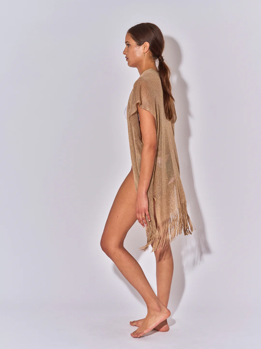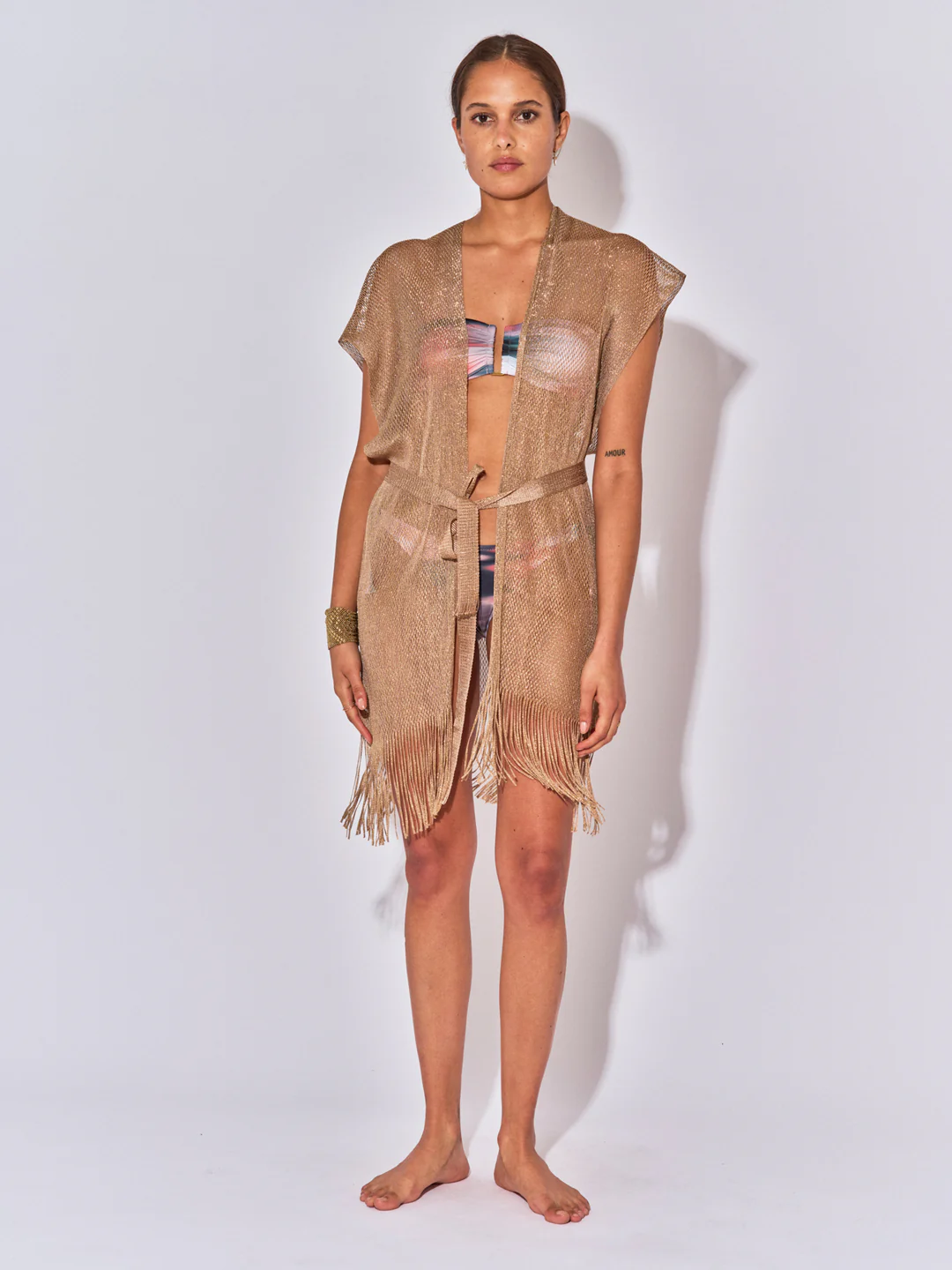Роскошная короткая туника для отдыха и пляжа Белиза Лима золотистого цвета - Beliza LIMLX-SIENNE-TU GILET COURT EN MAILLE SANS MANCHES DORE. Красивая блестящая фактура с люрексовыми нитями. Легкий халат из ткани-сеточки с глубокими разрезами по бокам и бахромой. Прямой крой, завязывается поясом. Пояс в цвет туники - в комплекте.