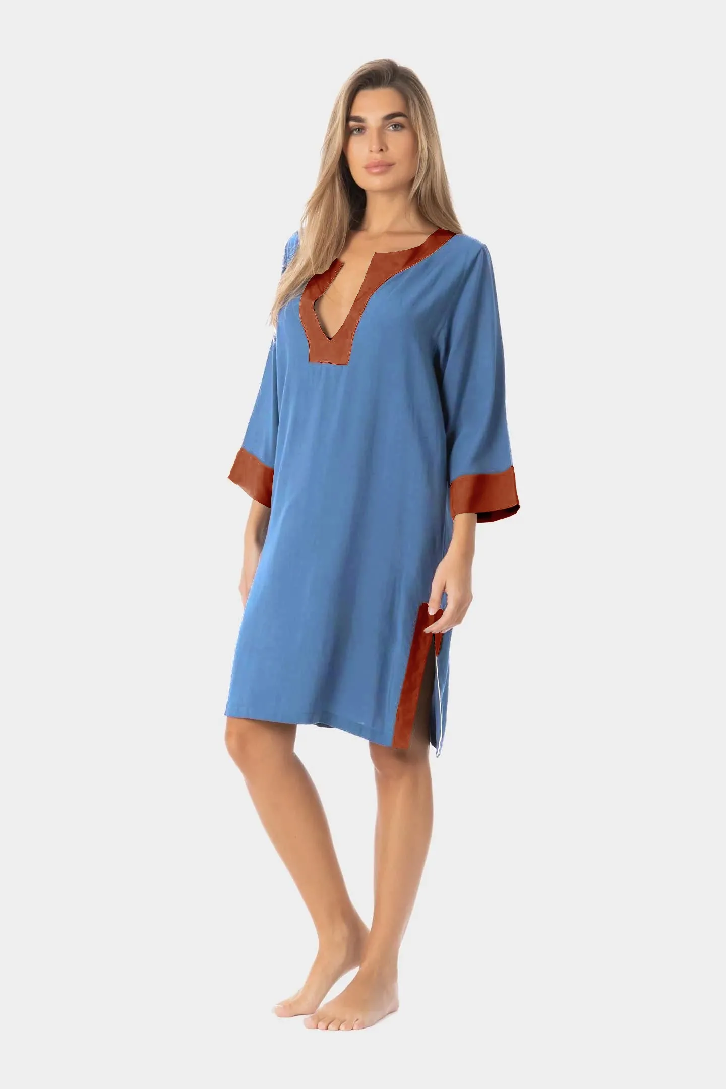 Короткое платье-туника Раджанти Оливия однотонное, голубое с оранжево-кирпичной отделкой - Ragganti Olivia Edged Short Kaftan Cover-Up W2060 3264 LIBECCIO PEAK. Выполнена из легкого, струящегося материала - 100% вискоза, текстильное полотно. V-образная горловина с глубоким вырезом. Широкие рукава 3/4. Прямой свободный крой, длина - выше колен. По бокам - глубокие разрезы с контрастной окантовкой.