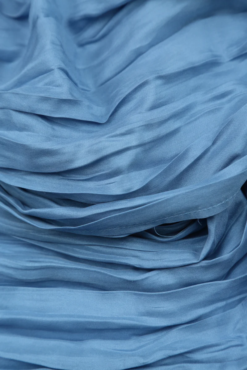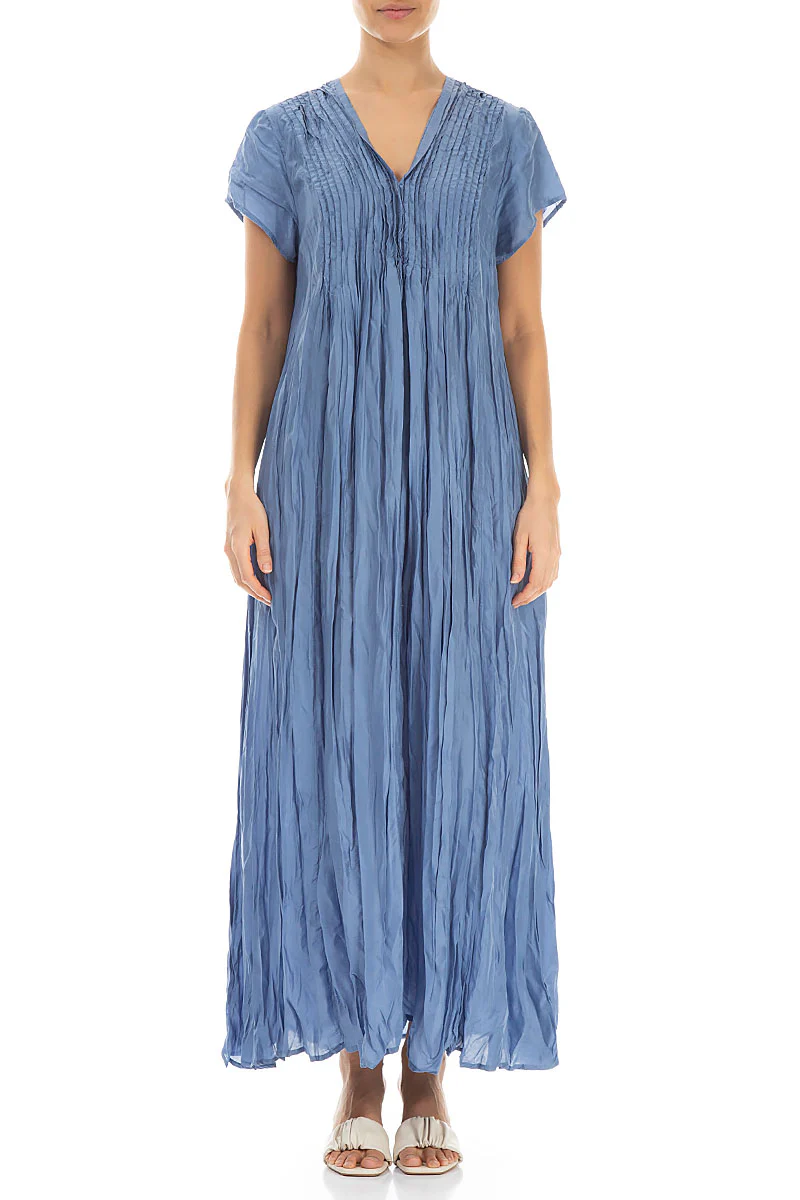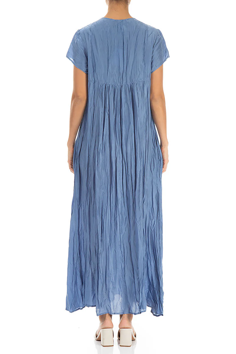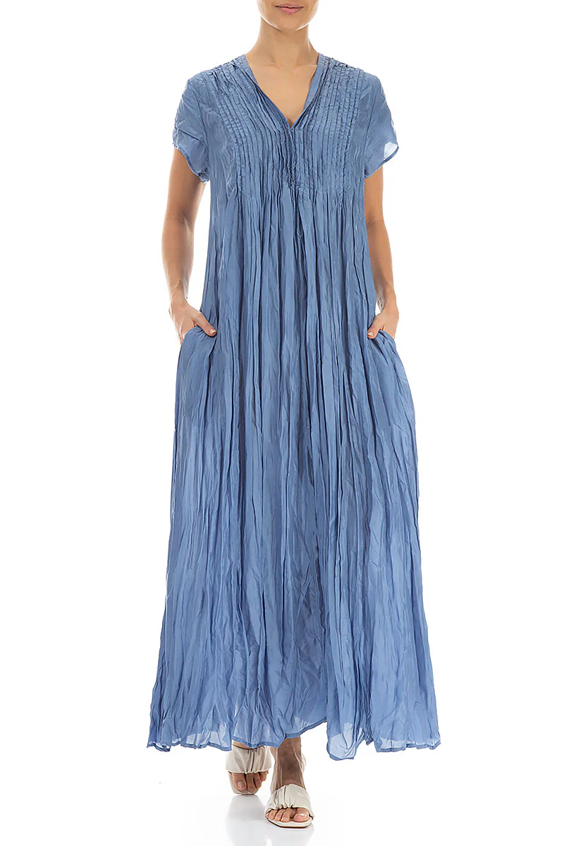 Великолепное шёлковое платье-макси Гризас светло-синего цвета - Grizas 5709-3-s125 604. 100% натуральный шёлк. Лёгкая ткань с интересной фактурой в жатые складки. Не требует глажки. A-образный, расширяющийся к низу силуэт от линии груди. V-образная горловина, боковые карманы, короткие рукава. Длина платья - до щиколотки. Стильный вневременной дизайн.