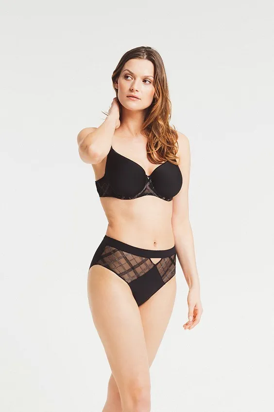 Высокие трусы-шорты Луиза Брак Албанах чёрного цвета - Louisa Bracq Albanach full brief сulotte 492 50 CHR noir. Красивое сочетание прозрачной сеточки, матового материала и плоской вышивку в клеточку в неоклассическом стиле XVII века, имитирующую металлическое плетение. Изысканный геометрический узор.