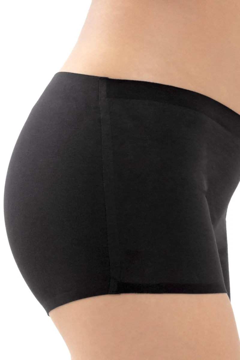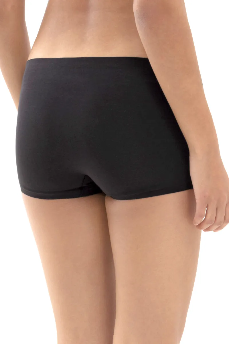 Трусы-шорты Мей Секонд Ми чёрного цвета - Mey Natural Second Me Shorts 79529 - 3 Schwarz. Выполнены из натурального комфортного материала: 90% хлопок, 10% эластан. Ластовица из 100% хлопка, удобно вшита в изделие. Гладкая фактура, эластичная окантовка по линии талии и вырезу ног. Трусики с плоским боковым бесшовным соединением и бесшовной уплотненной окантовкой по краю изделия - создают гладкий силуэт. Благодаря эластичности легко подобрать размер. Заниженная линия талии и полностью закрытые ягодицы, с короткими брючинами. Трусики широкие по бокам. Без центрального шва сзади.