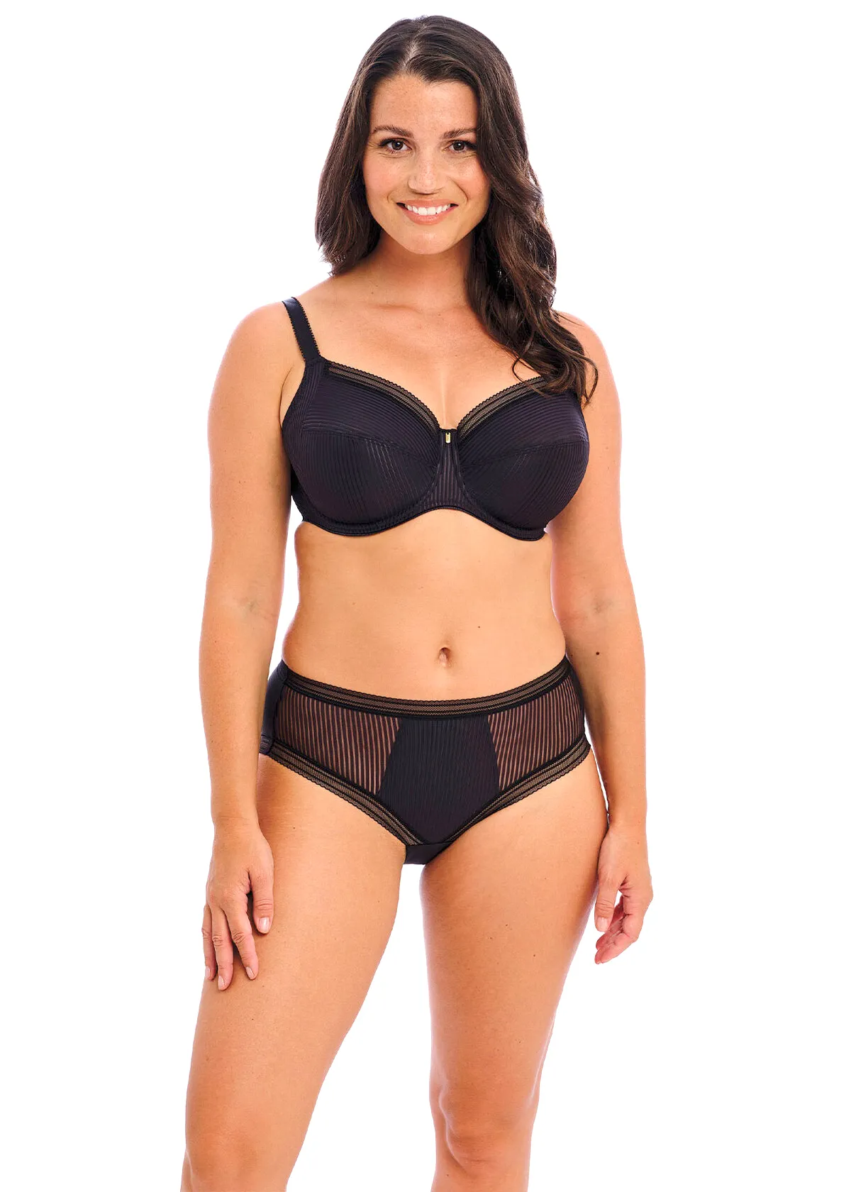 Классические трусики-бриф Фэнтези Фьюжн чёрного цвета - Fantasie Fusion Brief 3095 BLK black. Выполнены из полупрозрачной нежной сеточки с жаккардовой текстурой в полоску впереди, сзади - гладкая шелковистая ткань. Край трусиков - с кружевной эластичной окантовкой и плоскими швами, не заметными под тонкой одеждой. Центральный шов - для идеальной посадки.