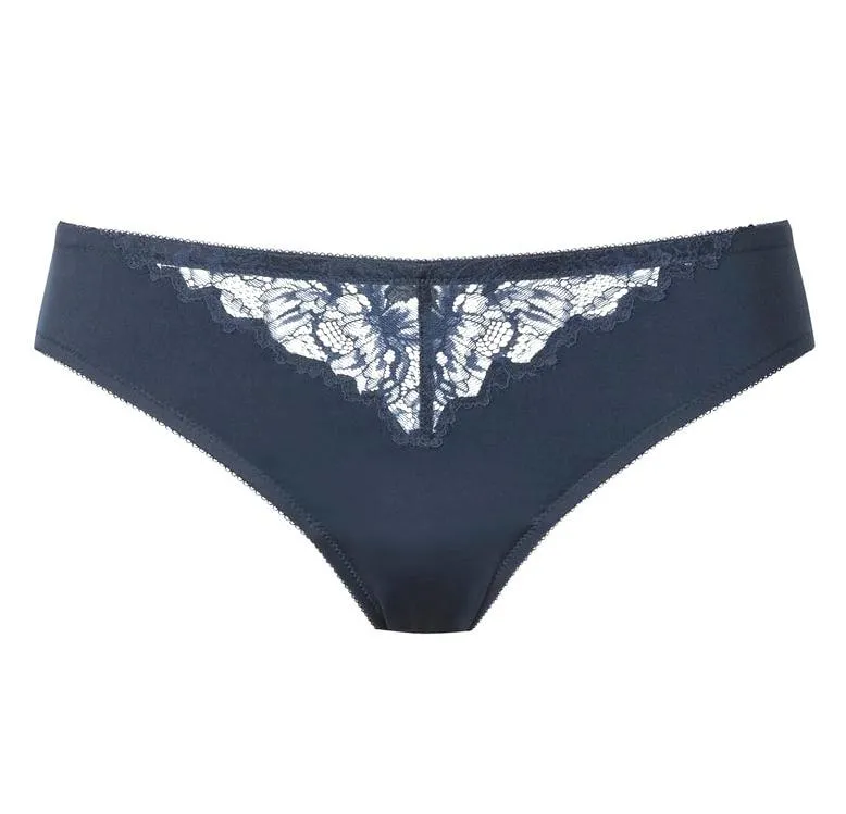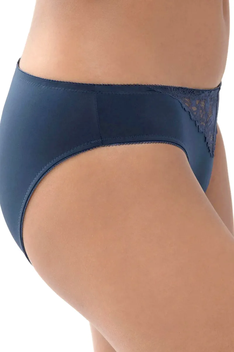 Классические трусы Мэй Лакшериос тёмно-синего цвета - Mey Luxurious 79283 mini briefs 408 night blue. Ластовица - 100% хлопок. Выполнены из непрозрачной шелковистой ткани с кружевной вставкой-треугольничком впереди. По поясу - узкий эластичный пояс-резинка. Швы в изделиях Mey очень мелкие, за счет чего достигается особая прочность и эластичность шва.