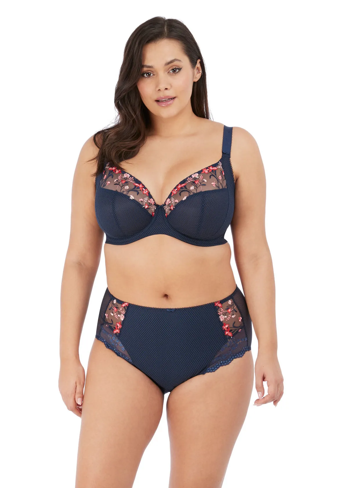 Прозрачные, сетчатые, кружевные трусы большого размера Эломи Чарли темно-синего цвета с ярко-красной вышивкой цветочками - Elomi Charley Full Brief 4388 Navy NAY. С игривой прозрачной сеточкой сзади и красивыми аппликациями вышитого кружева. 30% хлопка в составе.