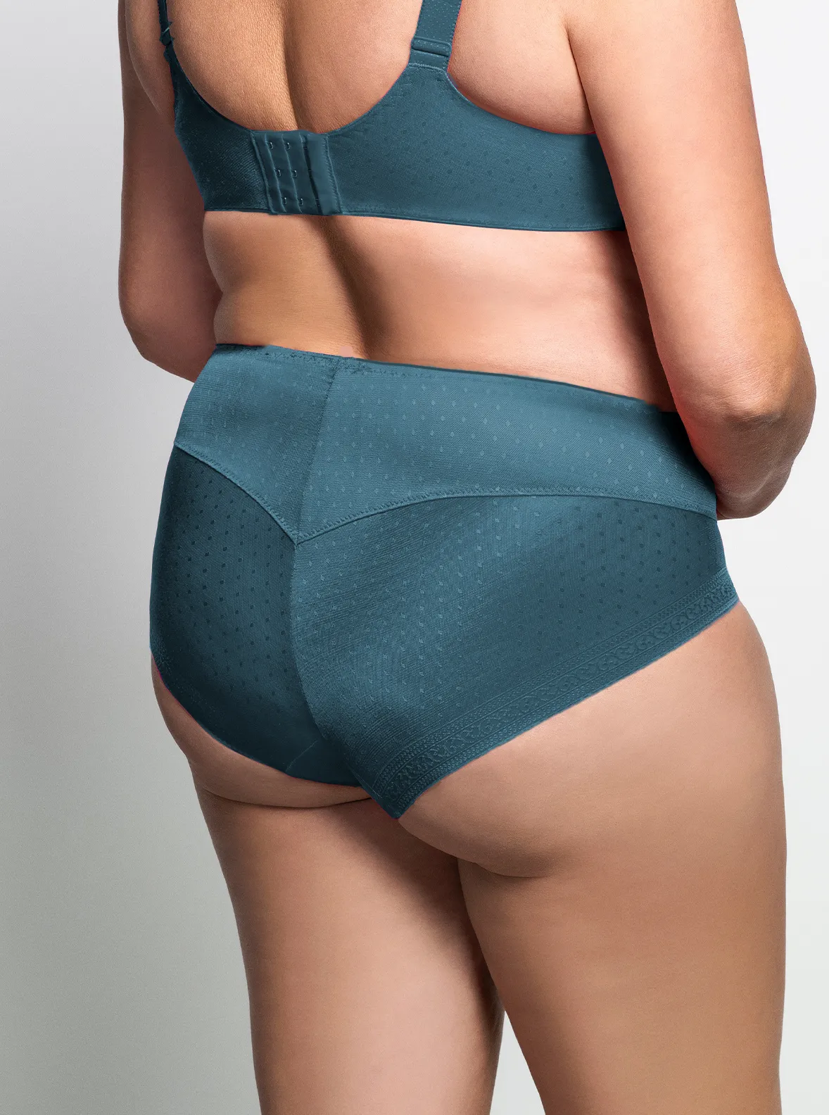 Трусы-слип Улла Меган в сеточку тёмно-бирюзового цвета океан - Ulla Meghan slip 048 ocean. Выполнены из плотной сеточкой с игривыми жаккардовыми горошками. Сзади - удобный центральный шов и конструкция, напоминающая бразильяна. Край трусиков сзади бесшовный, из эластичного жаккардового кружева.