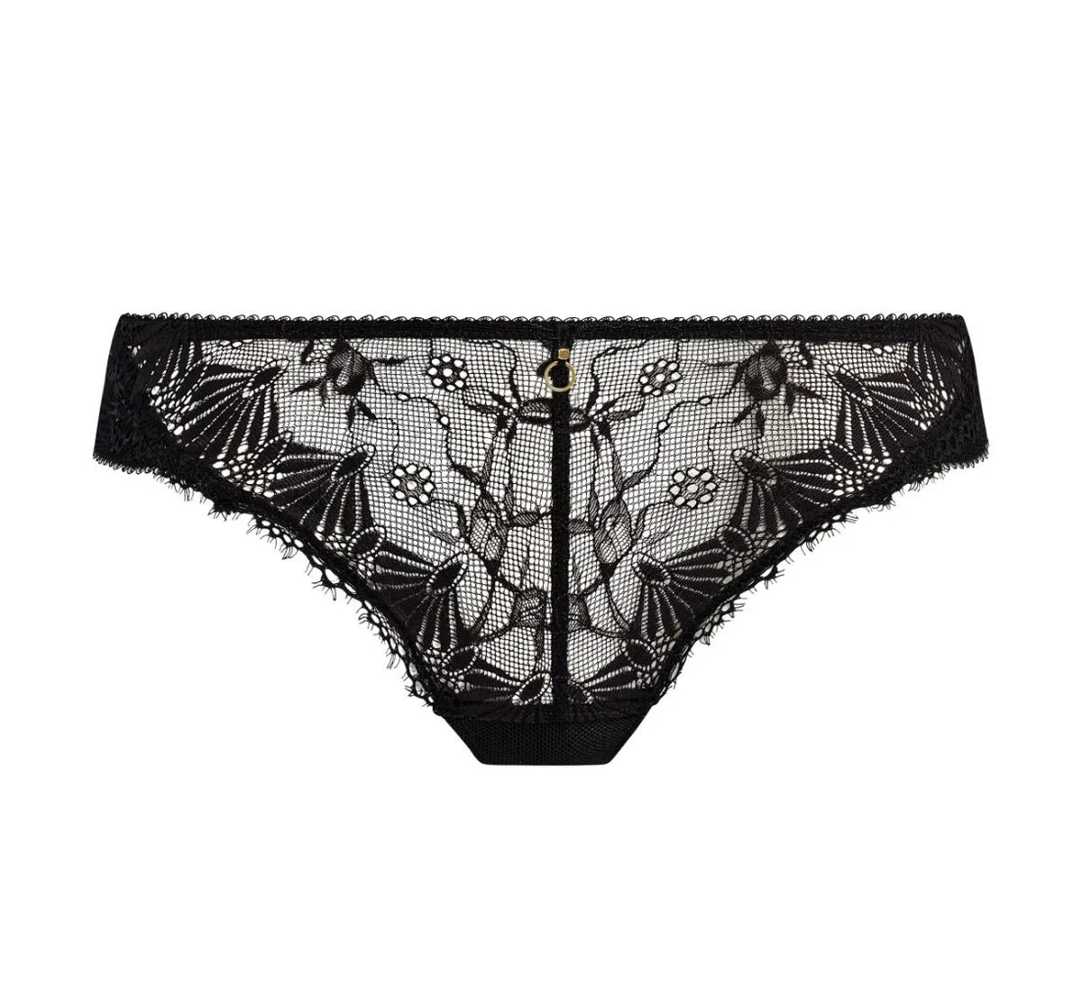 Кружевные полупрозрачные стринги Фрея Фасинэйт чёрного цвета - Freya Fascinate Thong 403170 - BLK black. Выполнены из прозрачной эластичной сеточки с цветочными и геометрическим орнаментом. Впереди украшены золотистым колечком. Трусы полностью прозрачные. По линии талии проходит плоский, эластичный пояс-резинка. Ластовица: 100% хлопок