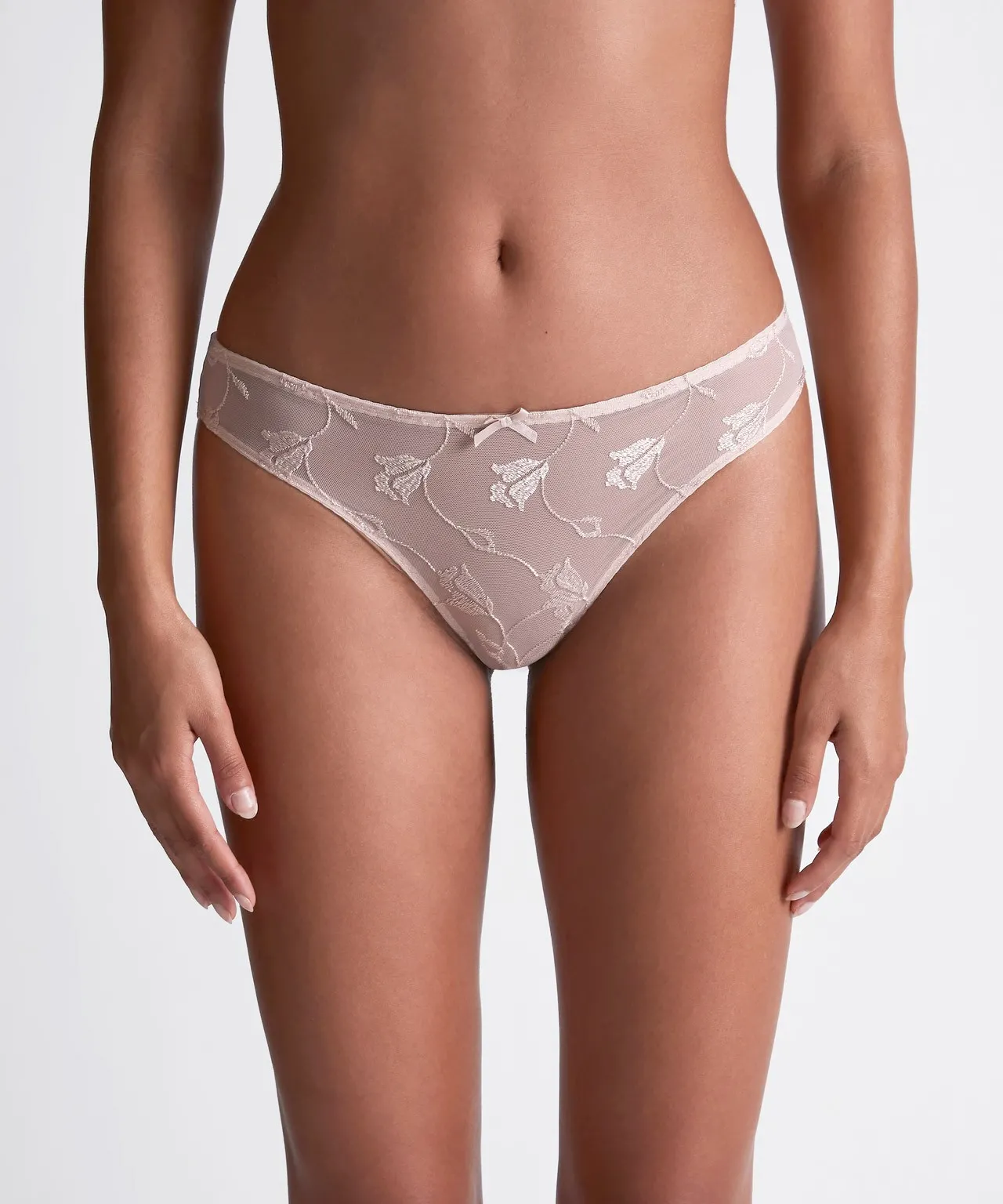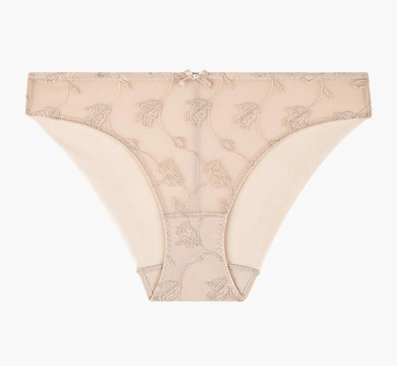 Кружевные трусы Обад Софтсенс натурально-бежевого цвета - Aubade Softessence brazilian brief TM22 skin. Впереди трусы - полупрозрачная вставка из кружева с цветочной вышивкой тюльпаны. Тончайшее швейцарское кружево.