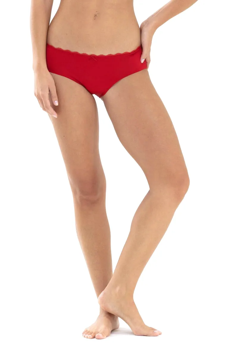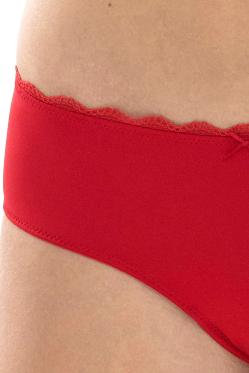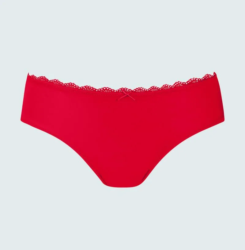 Кружевные трусы-хипстер / бразильяна Мей Амур ярко-красного цвета рубин - Mey Amorous Hipster 79803 410 rubin. Ластовица из 100% хлопка. Впереди выполнены из тонкой непрозрачной ткани с кружевной окантовкой. Сзади - изящное полупрозрачное кружево с центральным швом и наполовину открытыми ягодицами в форме бразильяны. По линии талии и вырезу ног впереди проходит узкая эластичная окантовка. Изделие соответствует сертификату Oeko-Tex-Standard 100 - ткань выполнена из экологичных и безопасных материалов.