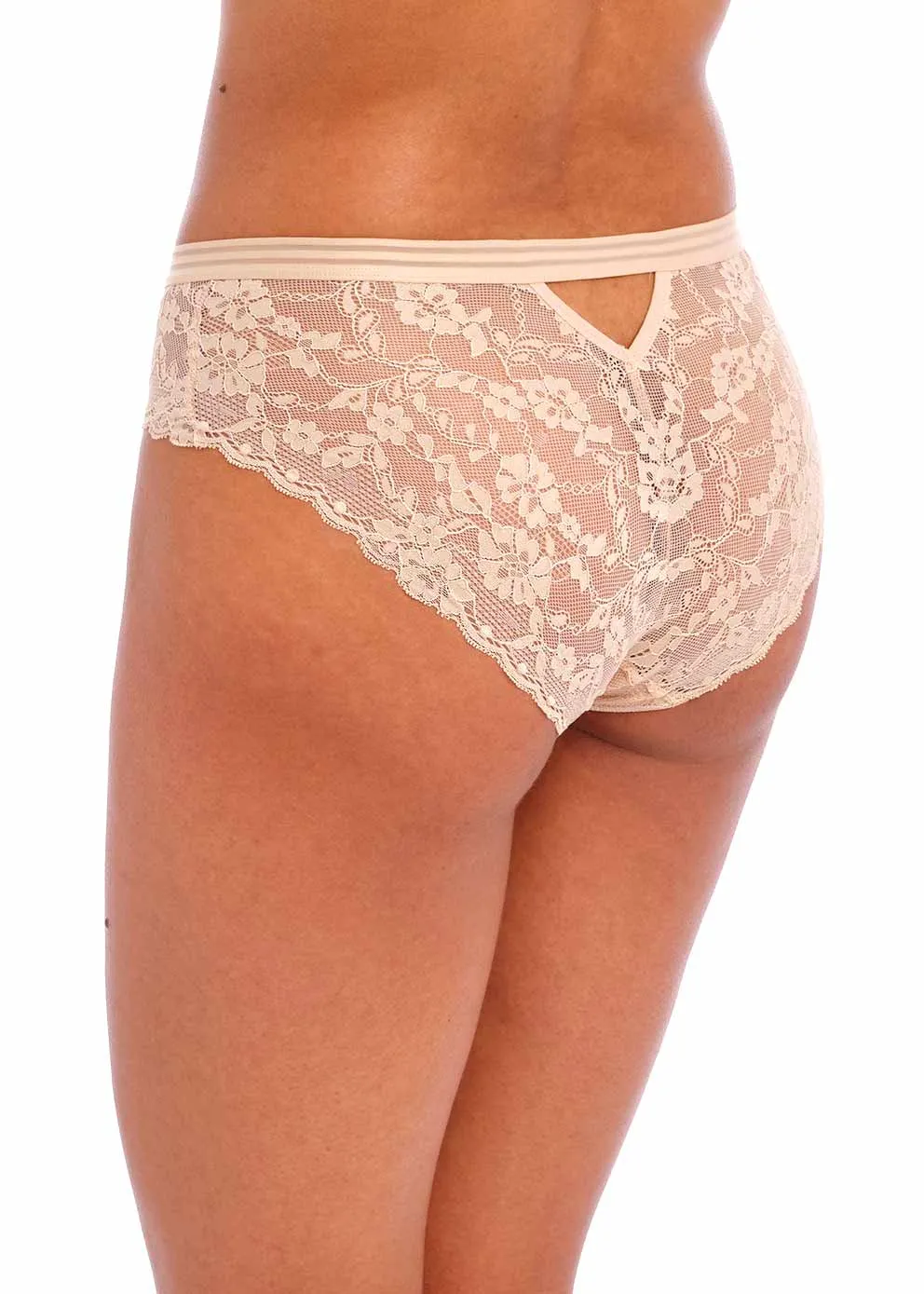 Кружевные трусики-бриф Фрея Оффбит натурально-бежевого цвета - Freya Offbeat BRIEF AA 5455 NAE Natural Beige. Выполнены из полупрозрачного эластичного кружева, сзади - соблазнительный вырез-треугольник. По линии талии проходит эластичный пояс контрастно-розового цвета.