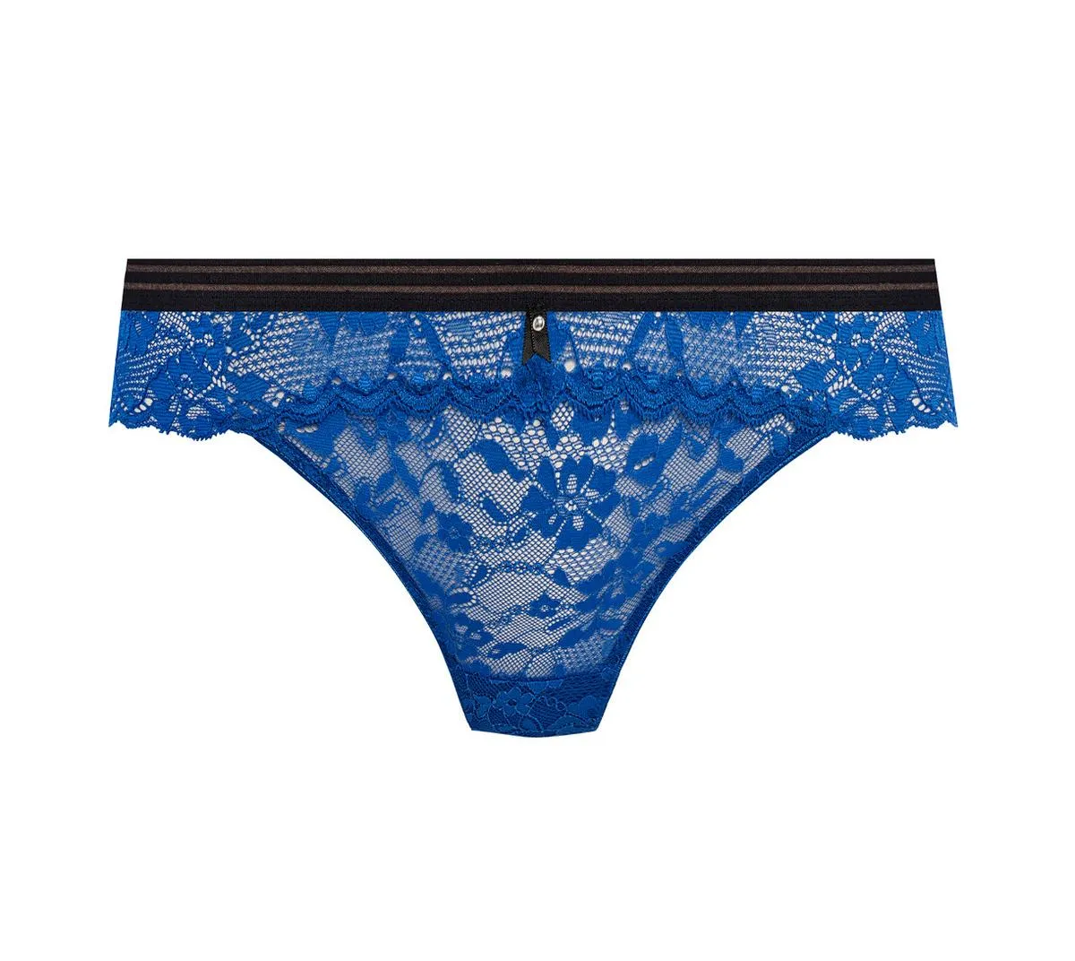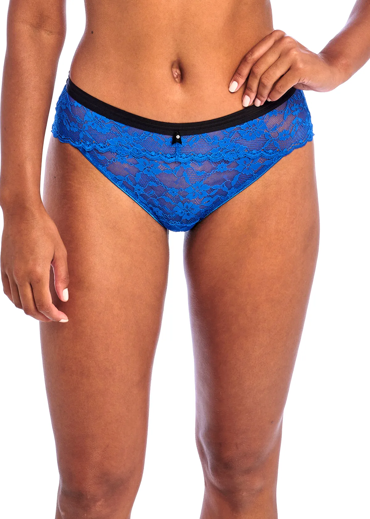 Кружевные трусики-бриф Фрея Оффбит насыщенного ярко-синего цвета - Freya Offbeat BRIEF AA 5455 DAZ Dazzling Blue. Выполнены из полупрозрачного эластичного кружева, сзади - соблазнительный вырез-треугольник. По линии талии проходит эластичный пояс розового цвета с полосатой фактурой. Ластовица из 100% хлопка.