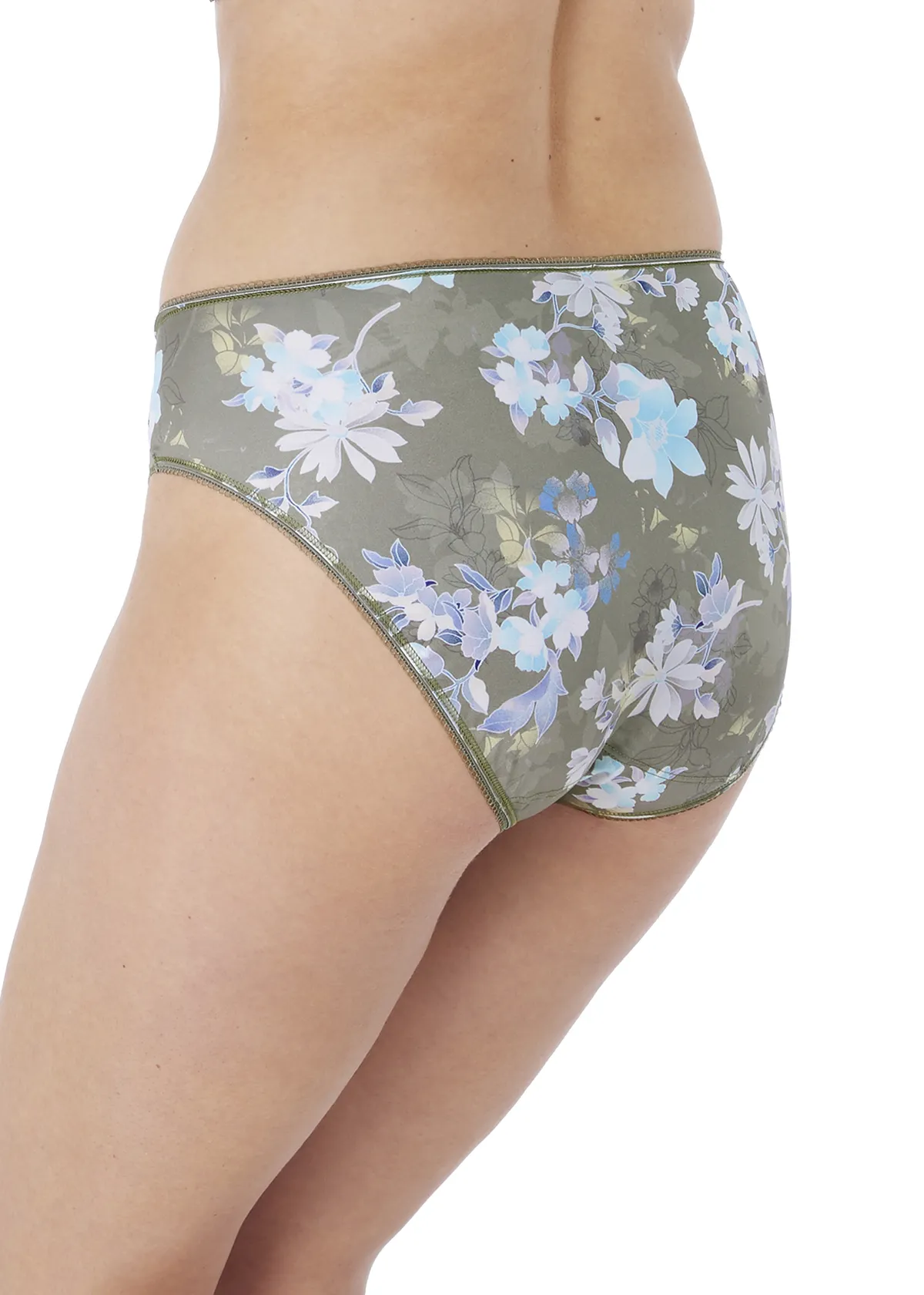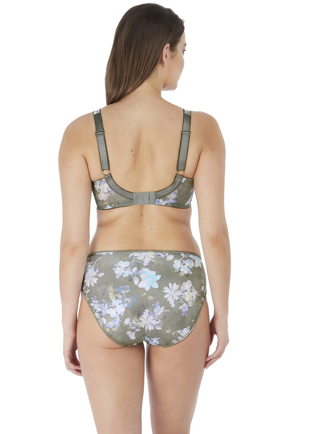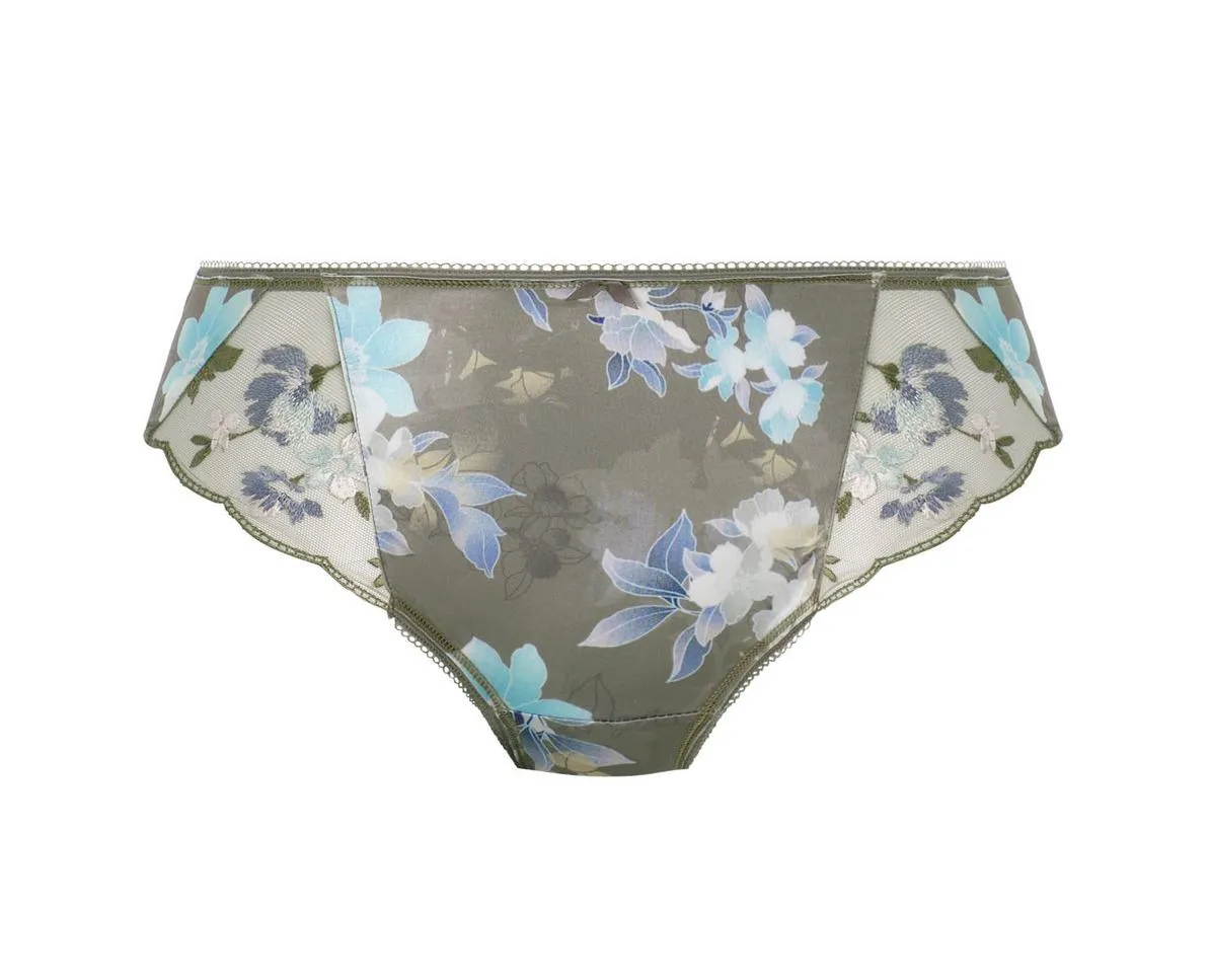 Кружевные трусы-бриф Фэнтези Эмми со вставками из тончайшего швейцарского кружева впереди, сзади выполнены из непрозрачной матовой ткани - Fantasie Emmie Brief 6925 Evergreen EVN. Флористический принт на оливково-зеленом фоне.