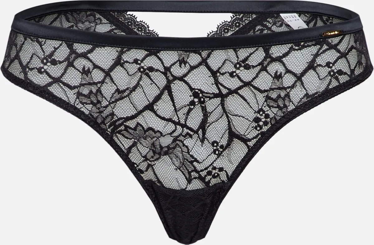 Кружевные трусы-стринги Шантель Сегур черные, полностью кружевные впереди и сзади. Игривое окошко-треугольник и окантовка атласными лентами добавляет особого настроения этой модели. Кружево мягкое и эластичное, не скручивается по краям.