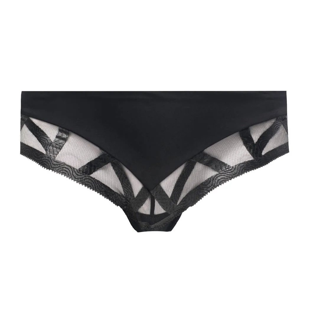 Кружевные трусы-бразильяна Луиза Брак Сэри черного цвета - Louisa Bracq Serie Brazilian shorty 471 43 NR0. Открытая сзади модель. По центру впереди и сзади эффектный непрозрачный треугольничек. Полупрозрачные вставки из тонкой сеточки с вышитыми ремешками-лентами. Вырез ног обработан плоской эластичной окантовкой.