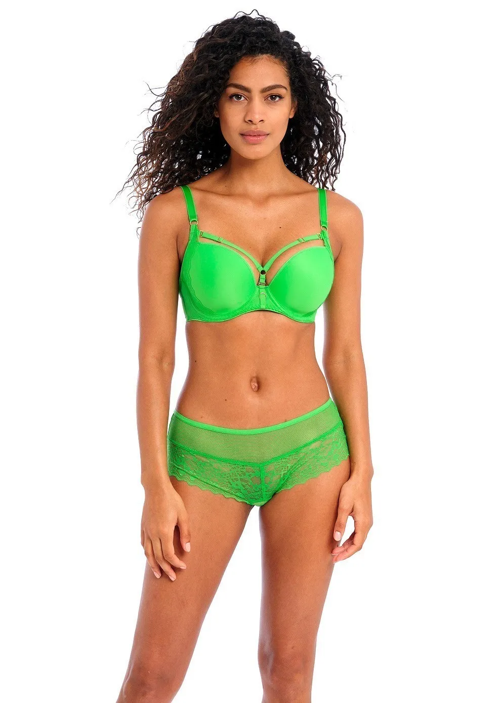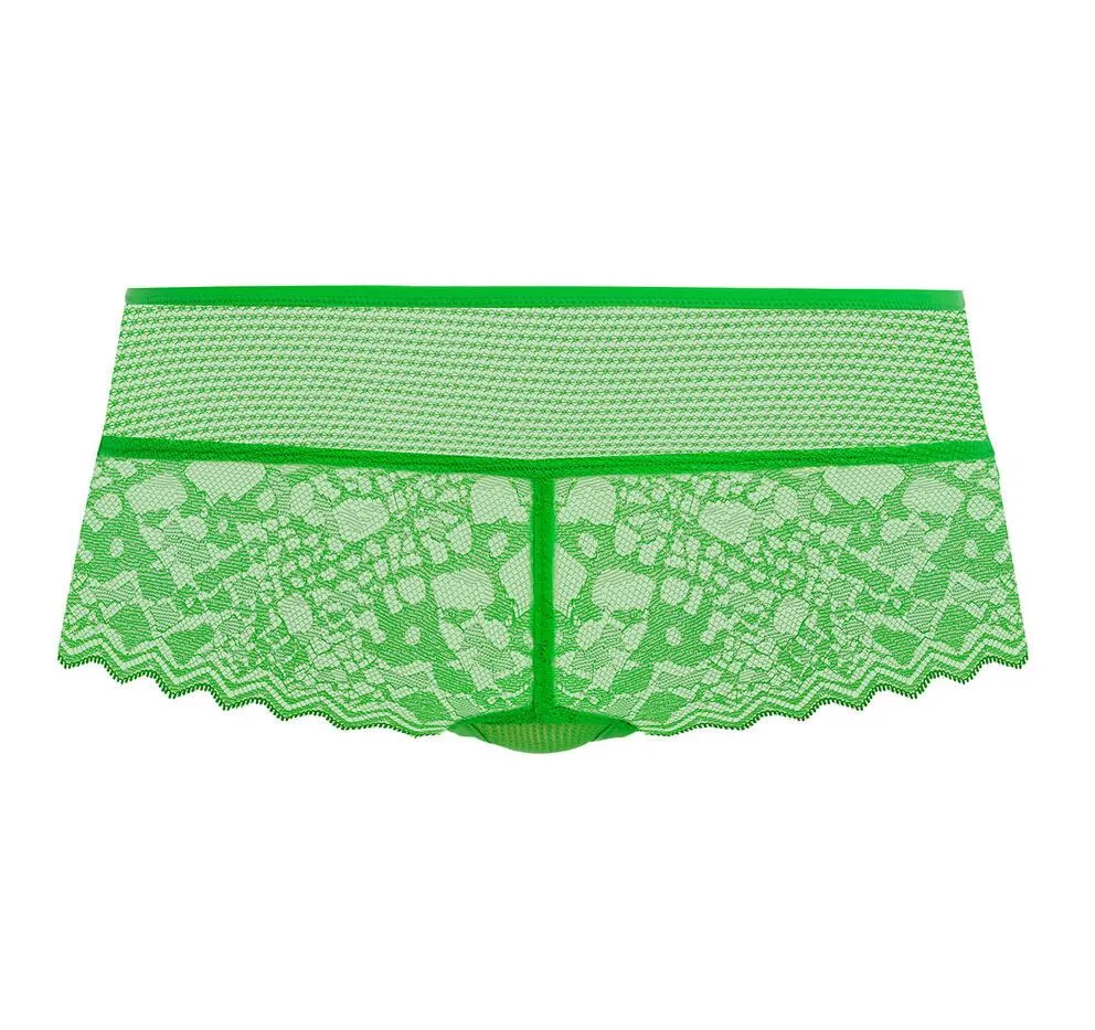 Кружевные трусы-шорты Фрея Темптресс ярко-зеленого цвета - Freya Temptress Short 400180 - Poison Green POG. Узкая эластичная окантовка по краю изделия. На боку - двойные узкие перемычки. Трусики выполнены из тонкой кружевной сеточки - впереди двойной, непрозрачный слой. Сзади полупрозрачное ажурное кружево с игривым открытым треугольнком.