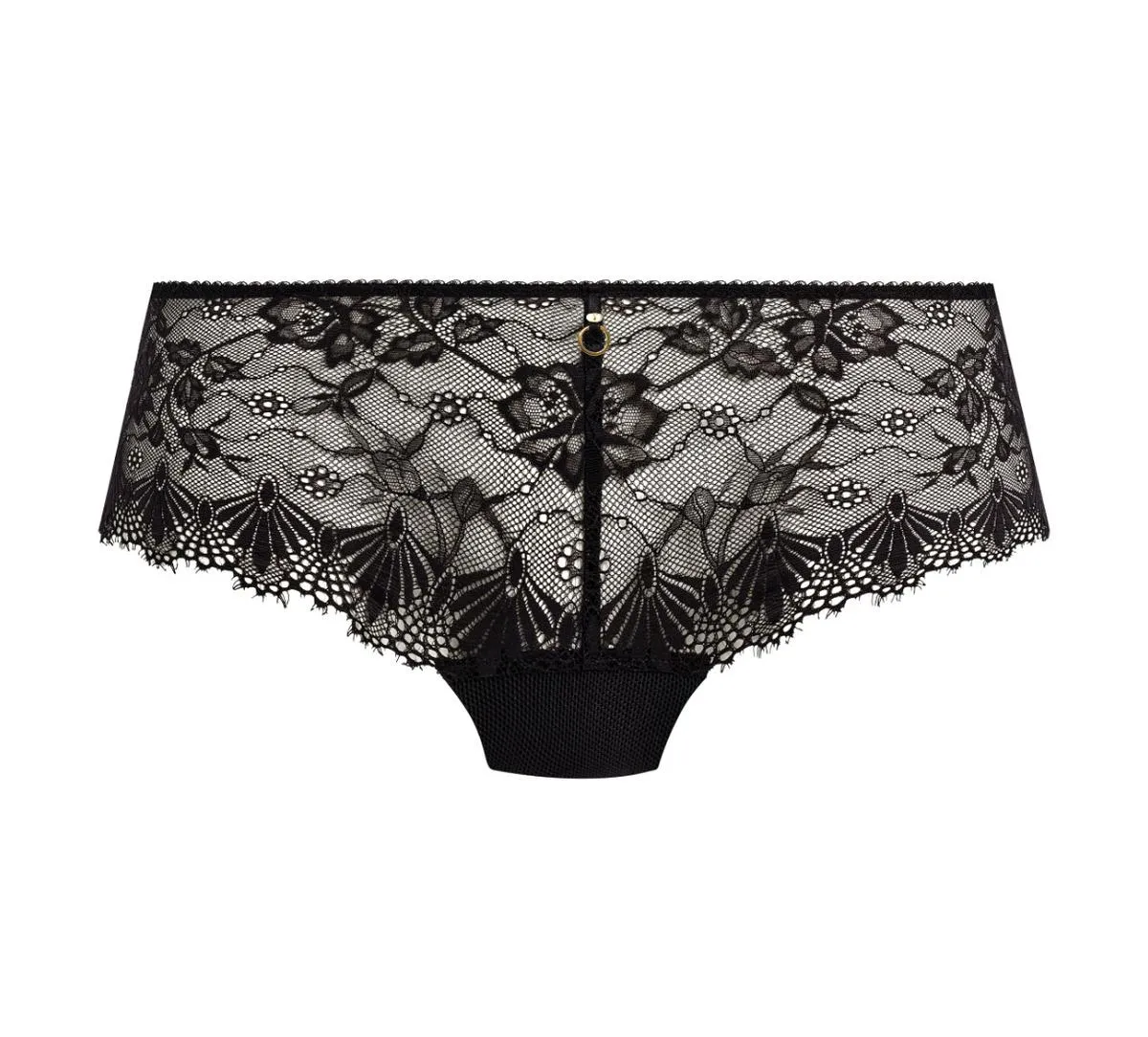 Кружевные трусы-шорты Фрея Фасинэйт чёрного цвета - Freya Fascinate 403180 - BLK black. Выполнены из прозрачной эластичной сеточки с цветочными и геометрическим орнаментом. Впереди украшены золотистым колечком, сзади - игривый треугольник. Трусы полностью прозрачные. По линии талии проходит плоский, эластичный пояс-резинка. Край трусиков по линии талии окантован узкой резинкой. Ластовица: 100% хлопок