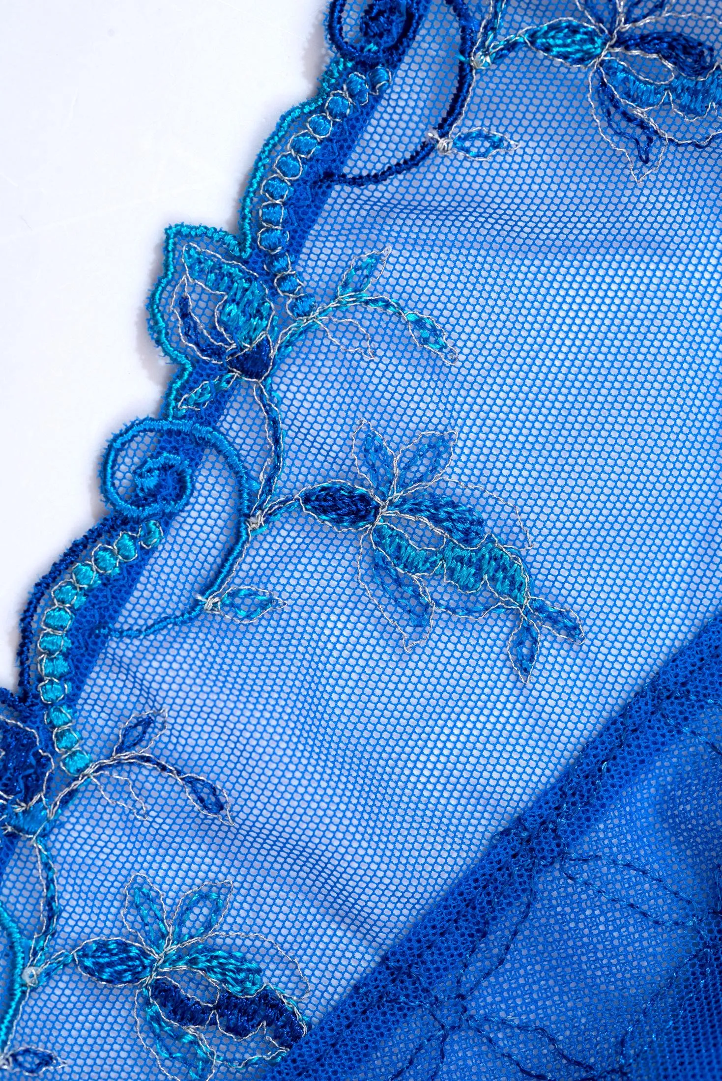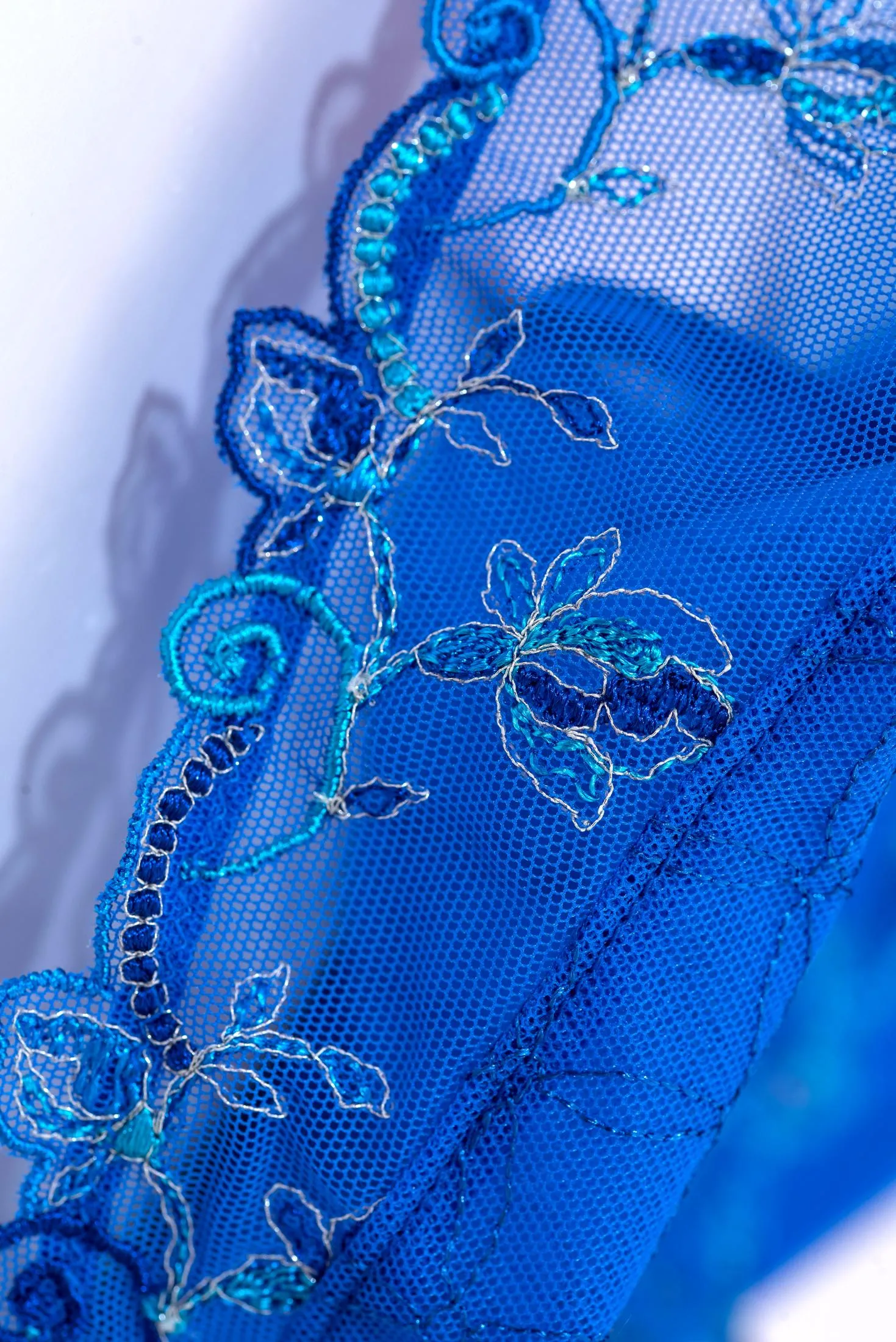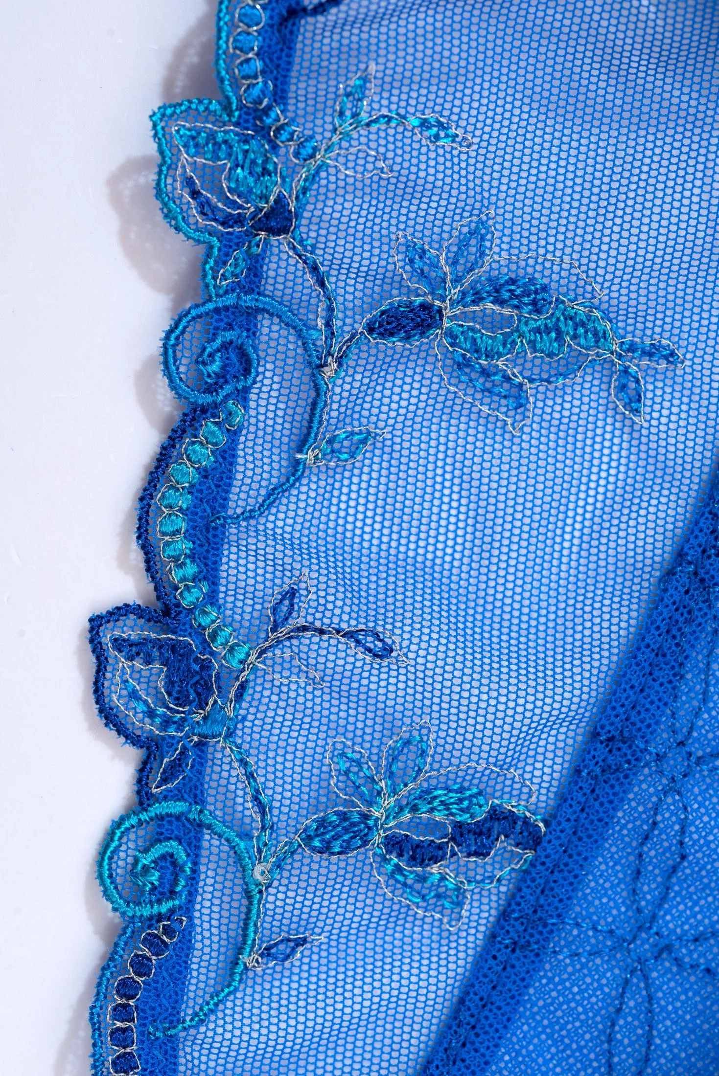 Трусики декорированы роскошной, разноцветной, итальянской вышивкой в несколько нитей. Легкий рисунок листьев и цветов подчеркивается серебристыми нитями, придающими объем и ощущение легкого движения. В этой линии сочетаются цветочные и геометрические узоры, создающие изящный графический рисунок.