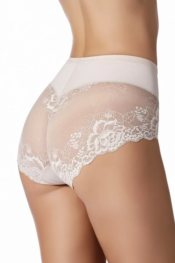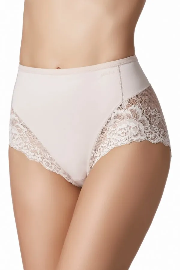 Высокие утягивающие кружевные трусы Джанира Грета Шейп песочно-бежевого цвета дюна, с тонким полупрозрачным кружевом сзади - Janira Greta Shape 1031869 / 31869 483 dune. Завышенная линия талии моделирует силуэт и утягивает живот. Ластовица из мелкой хлопковой гипоаллегренной махры.