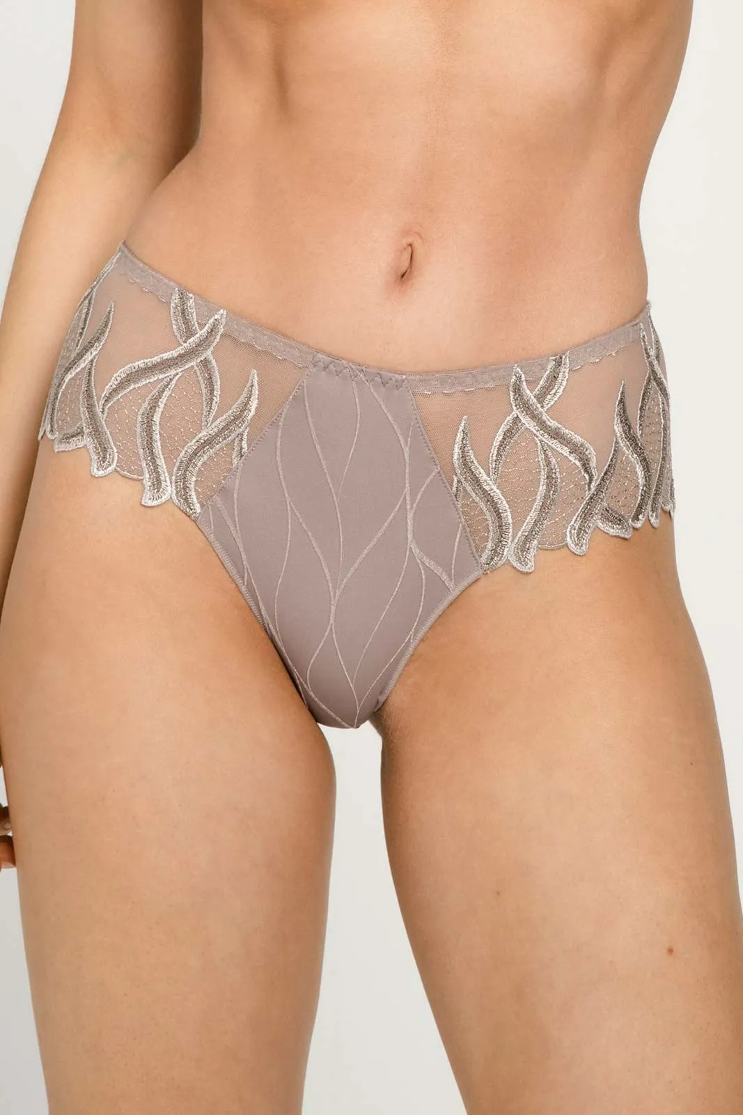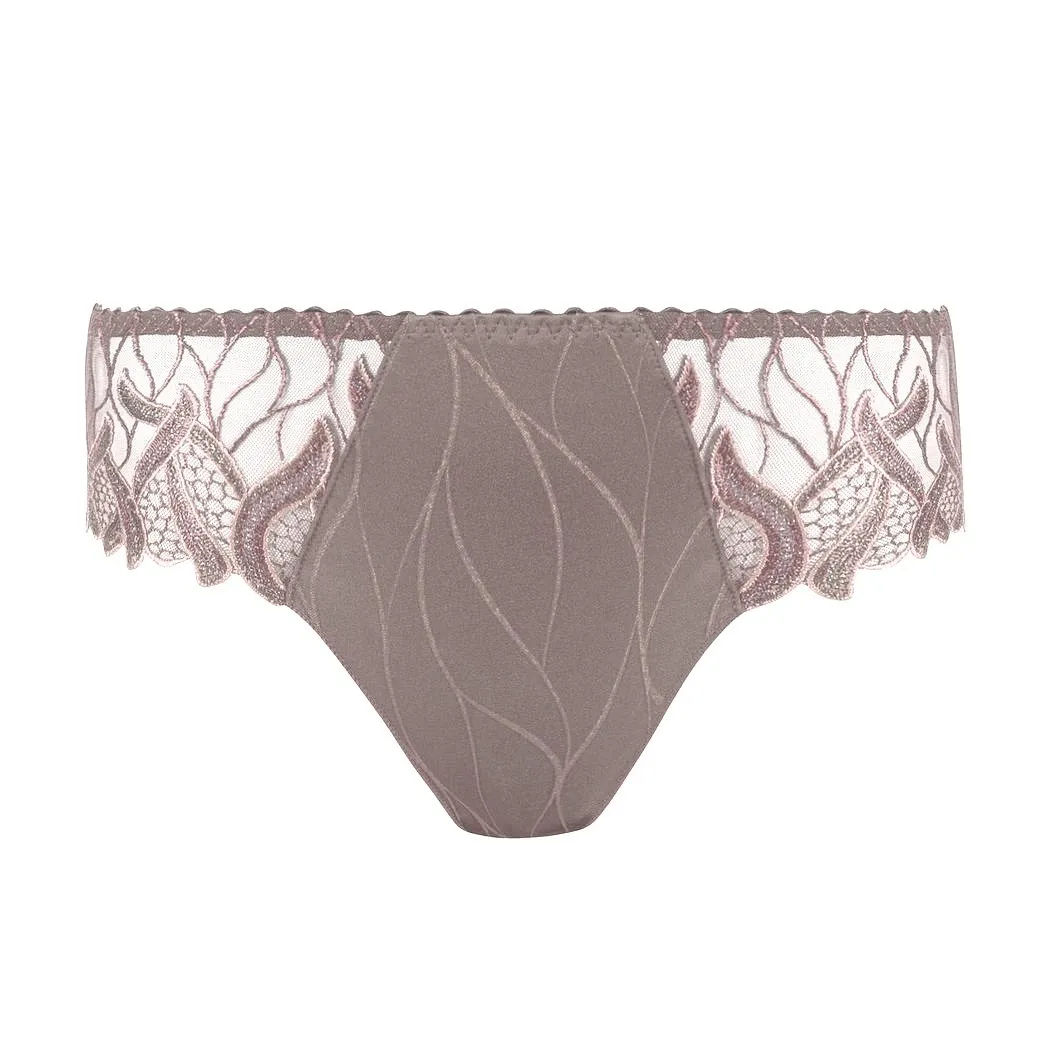 Роскошные кружевные трусы-шорты Луиза Брак Джулия кофейно-бежевого цвета тауп - Louisa Bracq Julia shorty taupe 477 40 TPE. Выполнены из полупрозрачного кружева с мотивами ар нуво. Впереди по центру непрозрачная вставка из текстурированного материала, жаккардовые рисунки которого напоминают мотивы кружева. Сзади шортики выполнены из широкого кружевного полотнища. По линии талии - узкий эластичный пояс-резинка с кружевной оборкой.