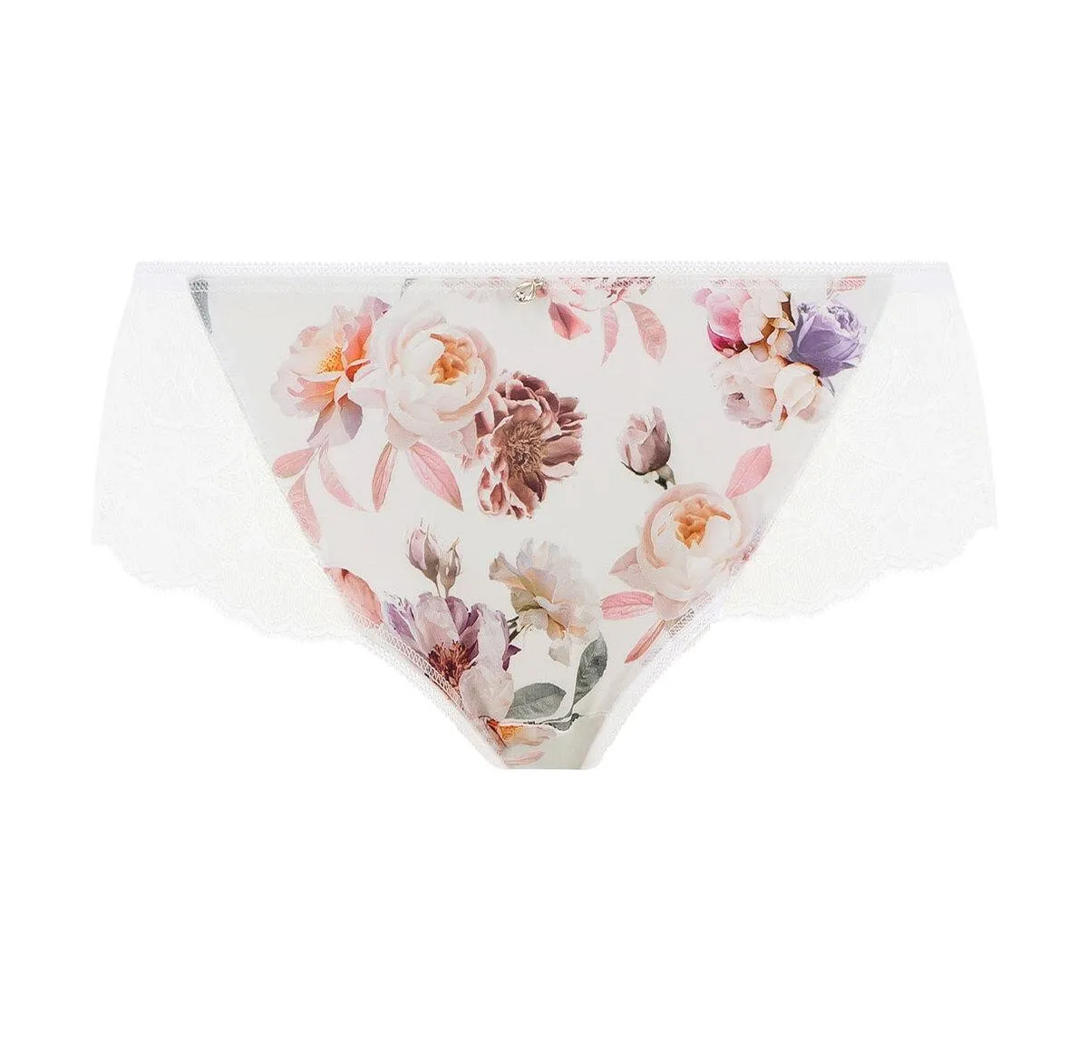 Кружевные трусы-бриф Фэнтези Пиппа со вставками из тончайшего швейцарского кружева - Fantasie Pippa 100780 white. Винтажный принт - розы на белом фоне. Впереди - центральная часть из непрозрачной шелковистой ткани, сзади и по бокам трусики полностью кружевные, с удобным центральным швом. Сзади- непрозрачный треугольничек. По линии талии проходит узкая эластичная окантовка. Ластовица - 100% хлопок.