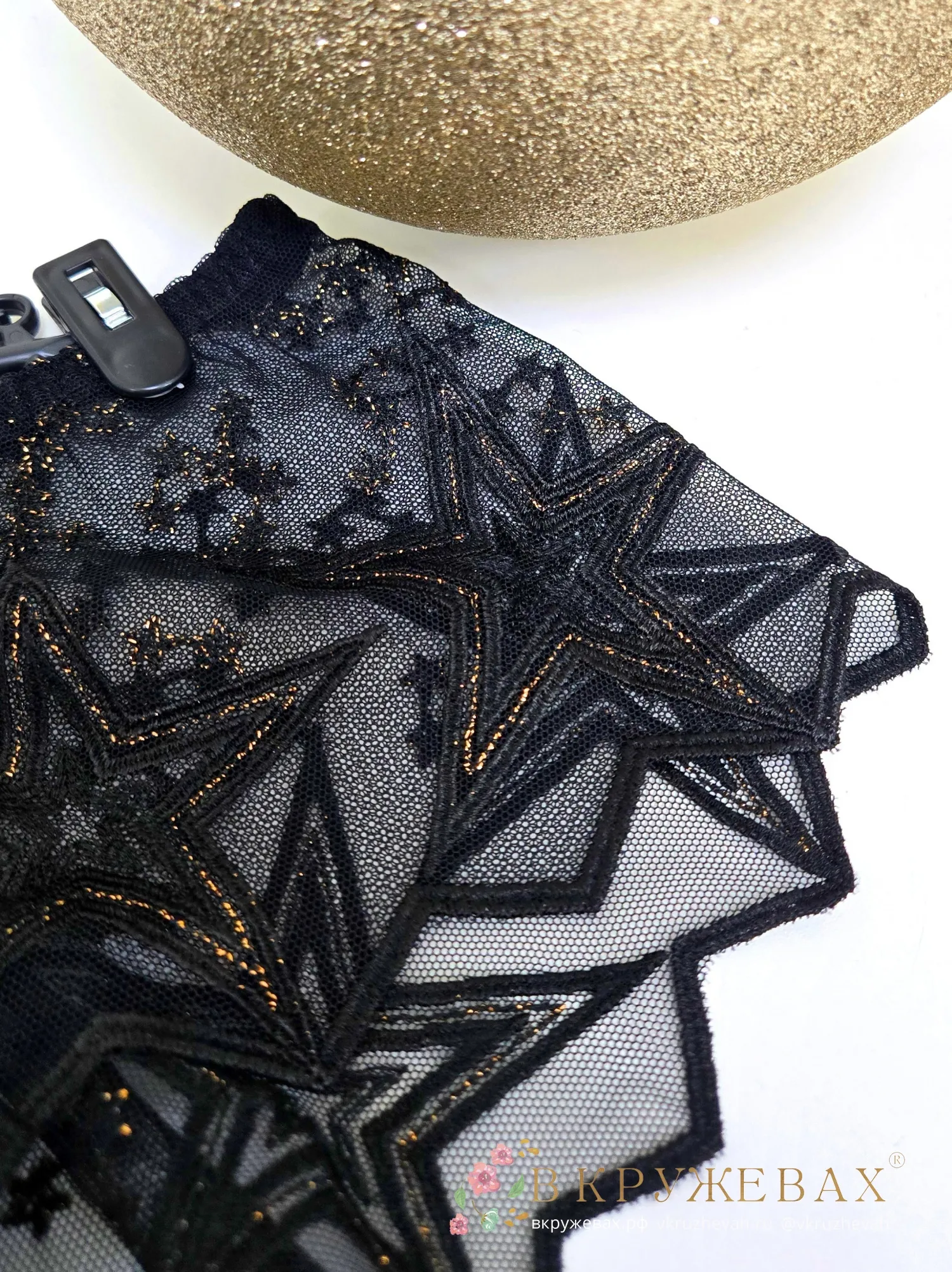 Кружевные трусы-шорты Луиза Брак Суперстар / Суперзвезда черного цвета - Louisa Bracq Superstar shorty 531 40 NOR. Впереди и сзади выполнены из полупрозрачной сеточки с вышитыми пятиугольными звездочками с золотистыми акцентами. Сзади - маленький непрозрачный треугольничек. Плоская вышивка не заметна под одеждой. Ластовица - 100% хлопок.