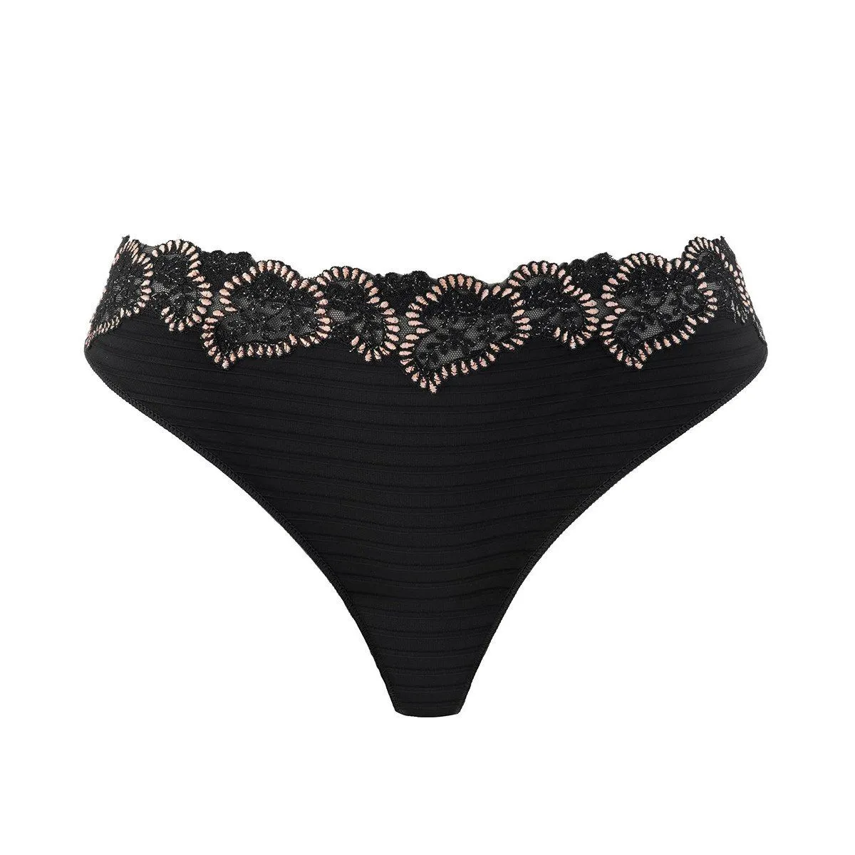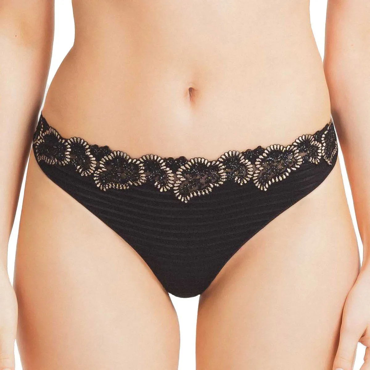 Трусы-стринги Луиза Брак Элис чёрного цвета с белыми акцентами - Louisa Bracq Elise Tanga 419 60 NBN. Впереди - из текстурированной ткани в рубчик. По линии талии украшены кружевом с растительными мотивами. Сзади - игривая сеточка и вышитый логотип LB.
