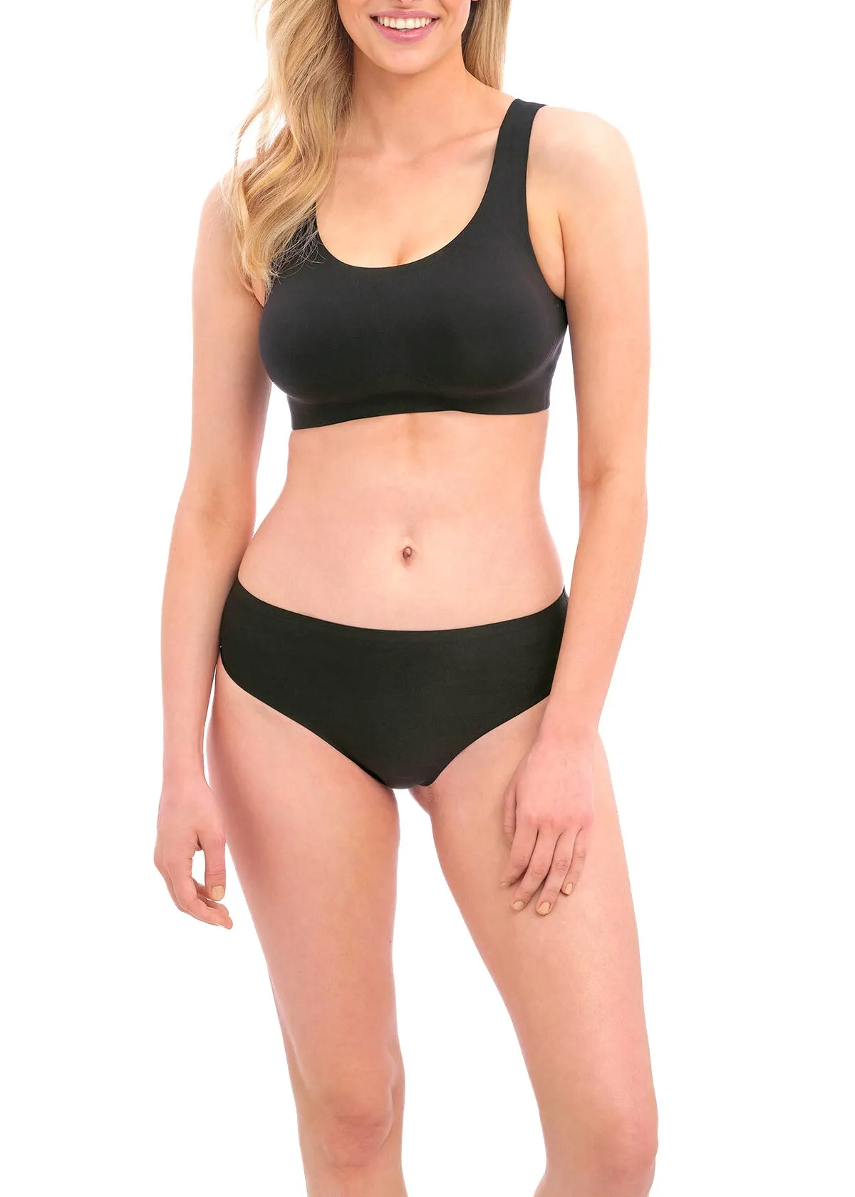 Бесшовные трусы-танга стринги универсального размера Фентези Смузи чёрного цвета - Fantasie Smoothease Invisible Stretch Thong 2327 BLK black. Выполнены из мягкой, комфортной ткани, не заметной на теле. Деликатная, бесшовная обработка края изделия. В составе - 15% спандекса, ткань эластичная, с небольшим эффектом коррекции фигуры - создает гладкий, ровный силуэт. Создает ощущение второй кожи. Детали соединены бесшовно, полностью незаметны. Эта английская линия похожа на французскую Chantelle Soft Stretch, но чуть-чуть плотнее. Замечательные отзывы от наших клиенток.