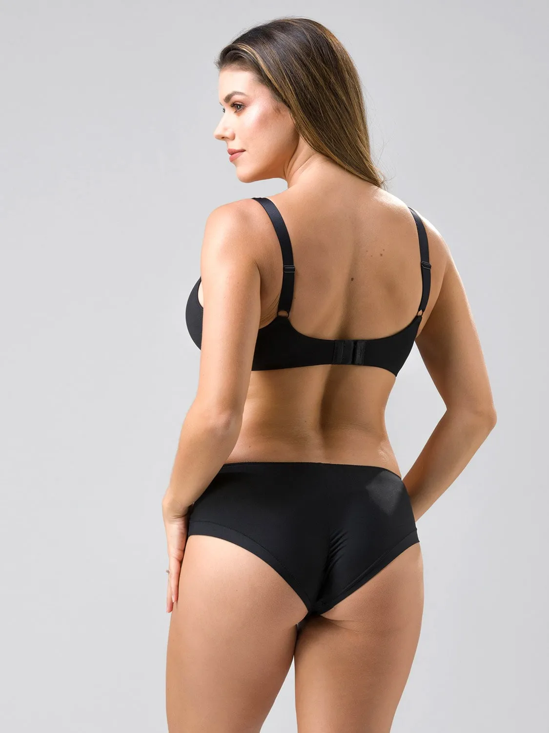 Классические трусики-бриф черного цвета Luna Splendida Selebration hipster 2964 black. Впереди вставки из полупрозрачной вышитой сеточки. По центру - матовая подложка, скрывающая тело. Сзади трусики выполнены из шелковистой, гладкой ткани. Центральный шов сзади обеспечивает хорошую посадку. Вырез ног обработан широкой окантовкой края с плоскими швами.