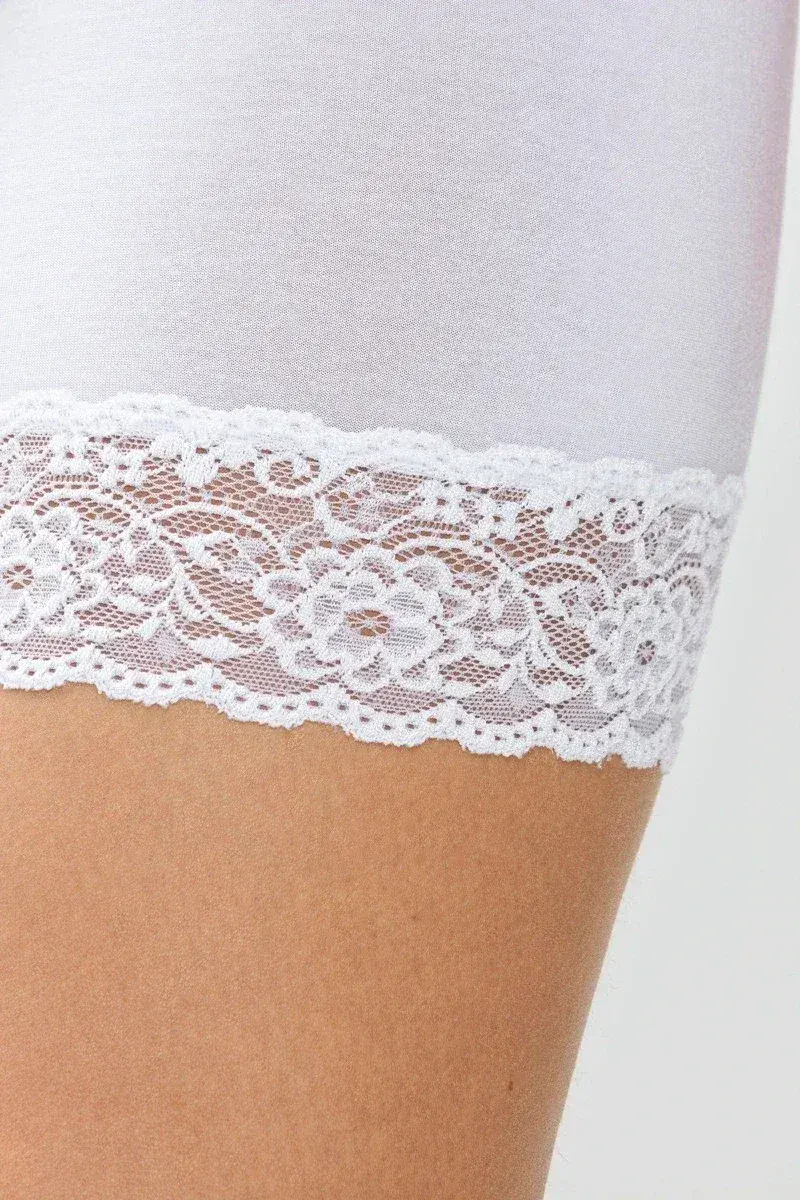 Панталоны с кружевом Мэй Лайтс белого цвета - Mey Lights long pants 88210 - 1 white.55% высококачественный перуанский хлопок, 40% вискоза, 5% эластан, ластовица - 100% хлопок. Завышенная линия талии сглаживает линию живота и бедер. По поясу - эластичный пояс-резинка средней ширины. Край штанин украшен эластичным кружевом. Швы в изделиях Mey очень мелкие, за счет чего достигается особая прочность и эластичность шва.