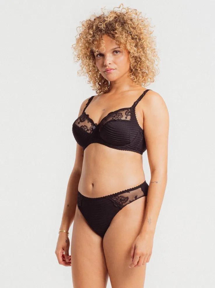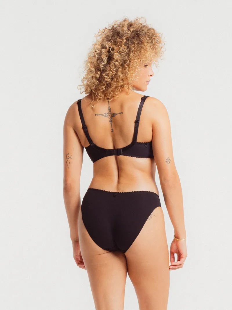 Классические трусы-бриф Луиза Брак Элис чёрного цвета - Louisa Bracq Elise rio brief rouge baiser 419 30 NRO noir. Впереди текстурированная ткань в рубчик сочетается со вставками из прозрачного кружева с вышивкой. Сзади - гладкая матовая ткань и вышитый логотип LB. Линия талии и вырез ног с эластичной окантовкой.